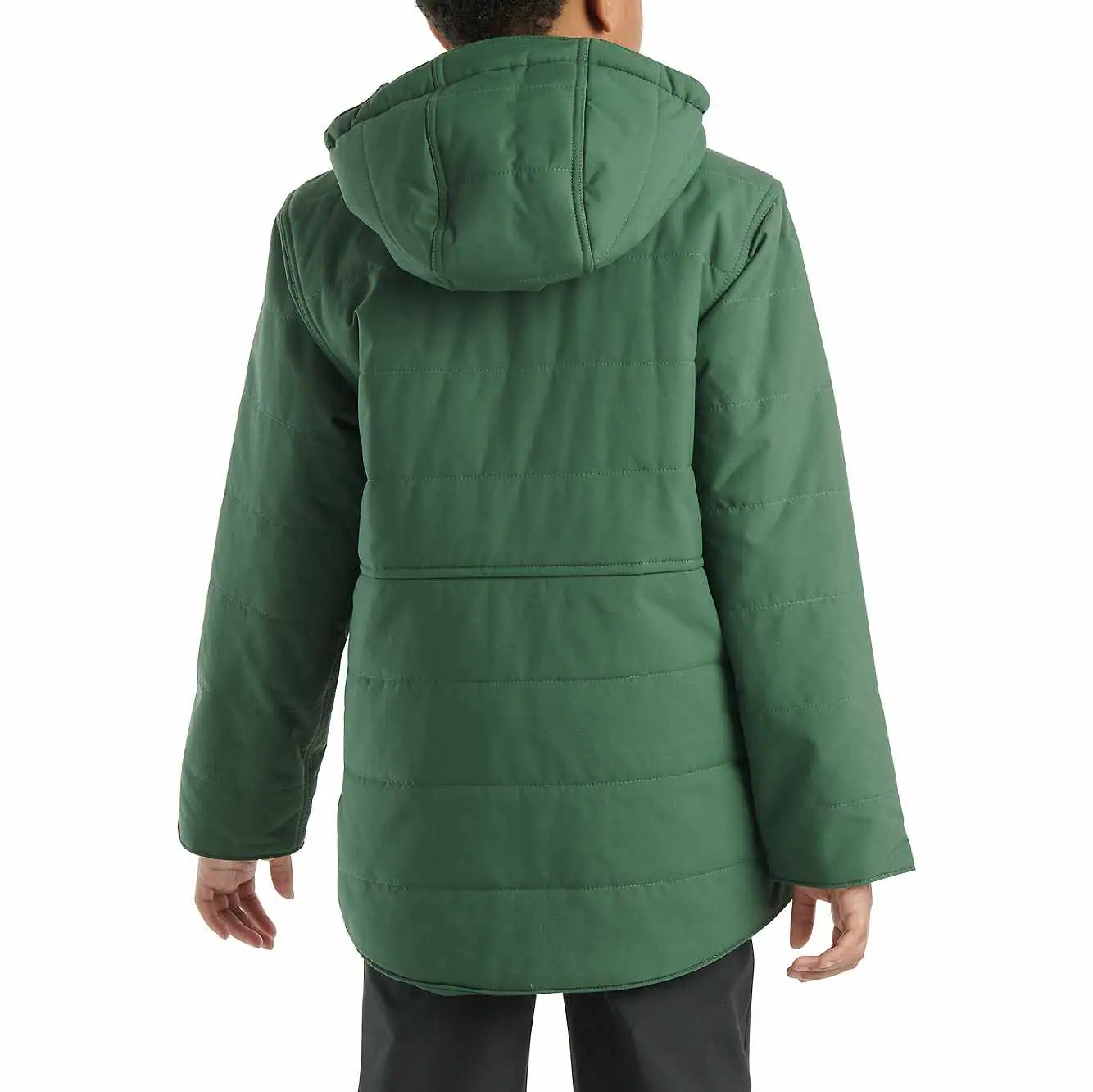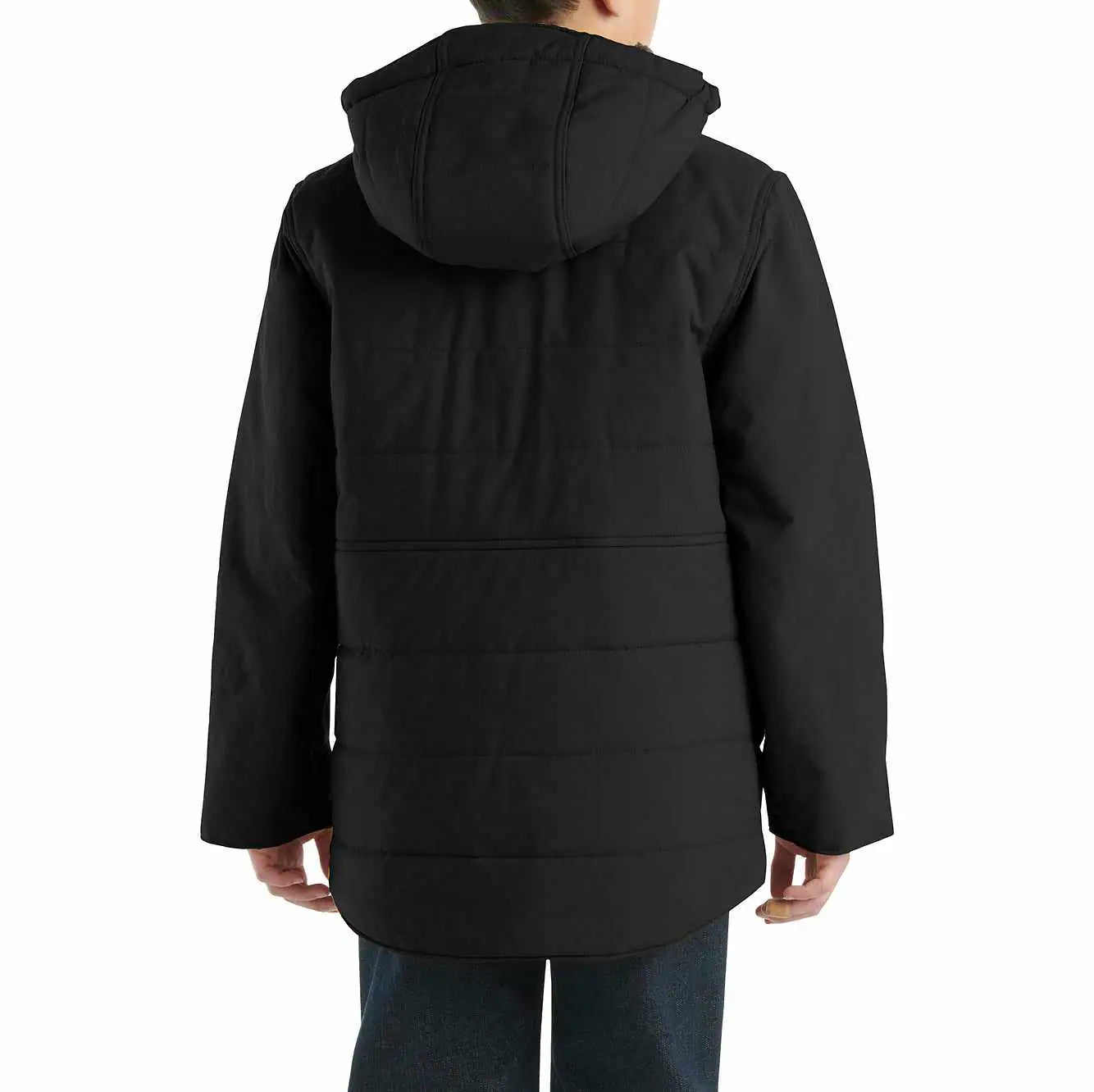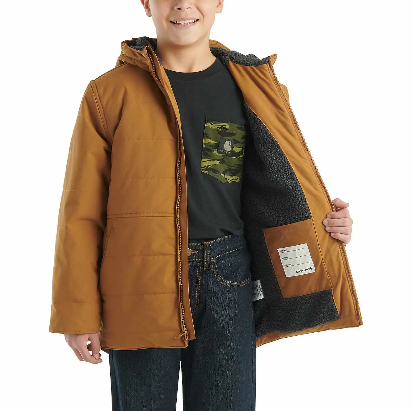 Send your child out the door all nice and bundled up in this boys' Carhartt insulated hooded jacket. Cold, gusty, rainy days are no match for its weather-ready, wind-conquering design. The fleece lining keeps it warm on the inside, while the water-repellent nylon shell toughs it out against the elements.