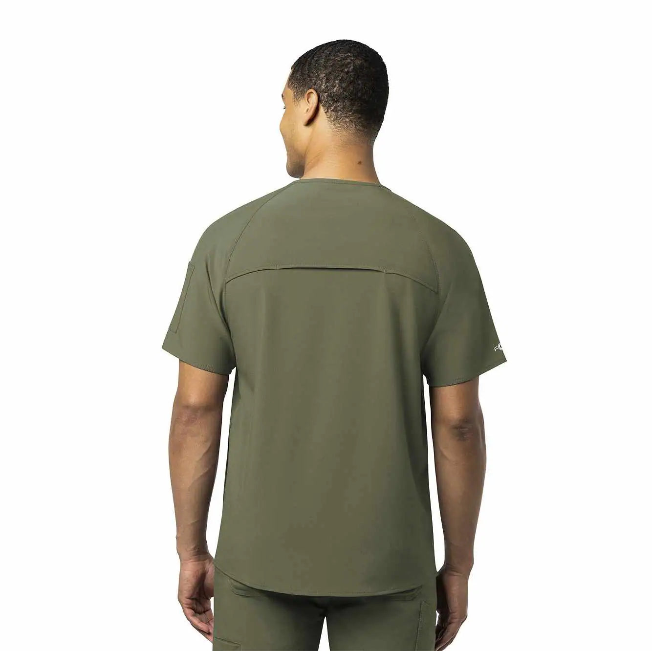 Stay connected and ready for the demands of your shift in this men's V-neck scrub top. The polyester blend is built for mobility and stain resistance to keep you clean and presentable all shift long. A dedicated media pocket includes routing for earbuds to keep cords safely out of the way. Easy access front chest pockets keep essentials close at hand.