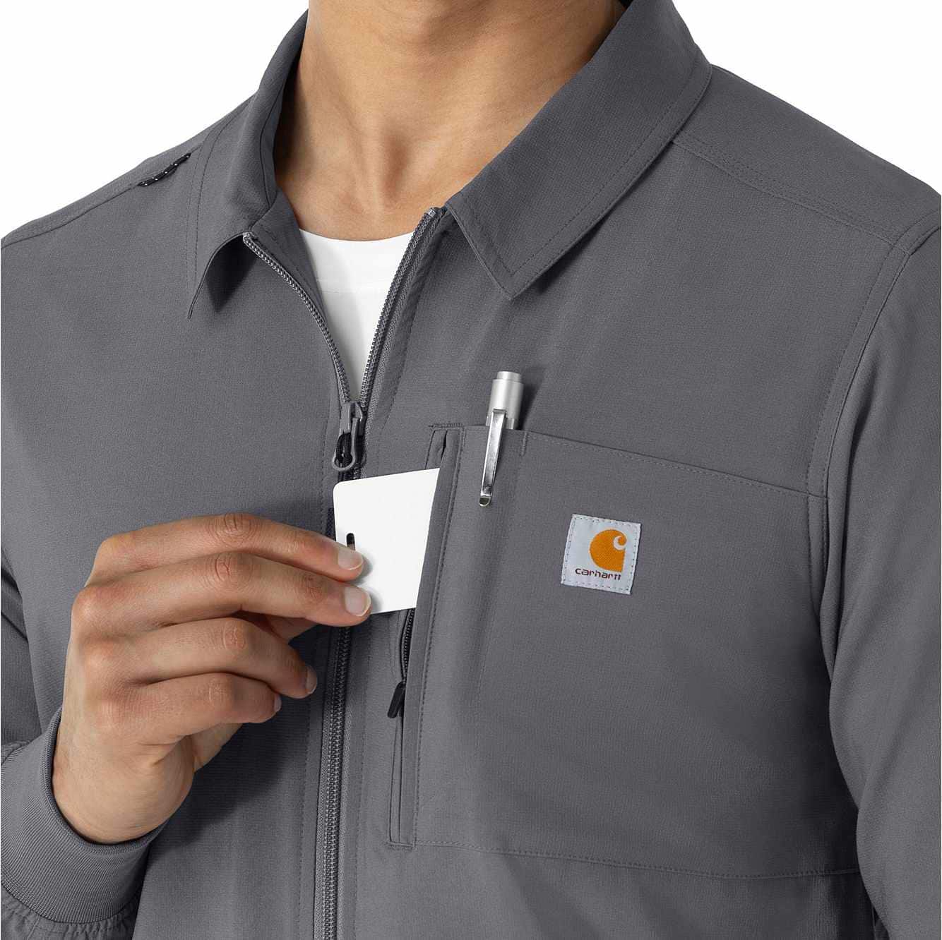 This men's Carhartt scrub jacket is a unique blend of classic workwear style and healthcare-specific functionality. At first glance, it resembles a traditional work jacket, but it's engineered to meet the unique demands of medical professionals. The Rugged Flex™ stretch fabric provides exceptional flexibility, allowing for unrestricted movement during busy shifts and demanding tasks. Functionality is a key focus, with a multitude of pockets strategically placed to keep essential tools and personal items organized and accessible. Notably, a dedicated stethoscope pocket ensures this crucial instrument is always within reach. The mesh-lined back vent promotes airflow, keeping you cool and comfortable even during long and strenuous periods. This jacket is designed to provide both durability and comfort. The robust construction ensures it can withstand the rigors of daily wear, while the thoughtful design details, such as the stretch fabric and ventilation, enhance overall comfort and performance. It's a reliable and practical choice for any healthcare professional seeking a durable and functional scrub jacket that can keep up with their demanding work environment.