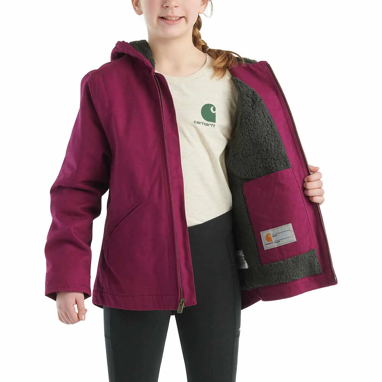 Playing outside is a year-round activity. This girls' full-zip jacket gives kids an extra layer of warmth through the winter. It has a rugged canvas construction that's lined with soft sherpa. The insulated front pockets give her a place to heat up her hands or hide away small treasures.