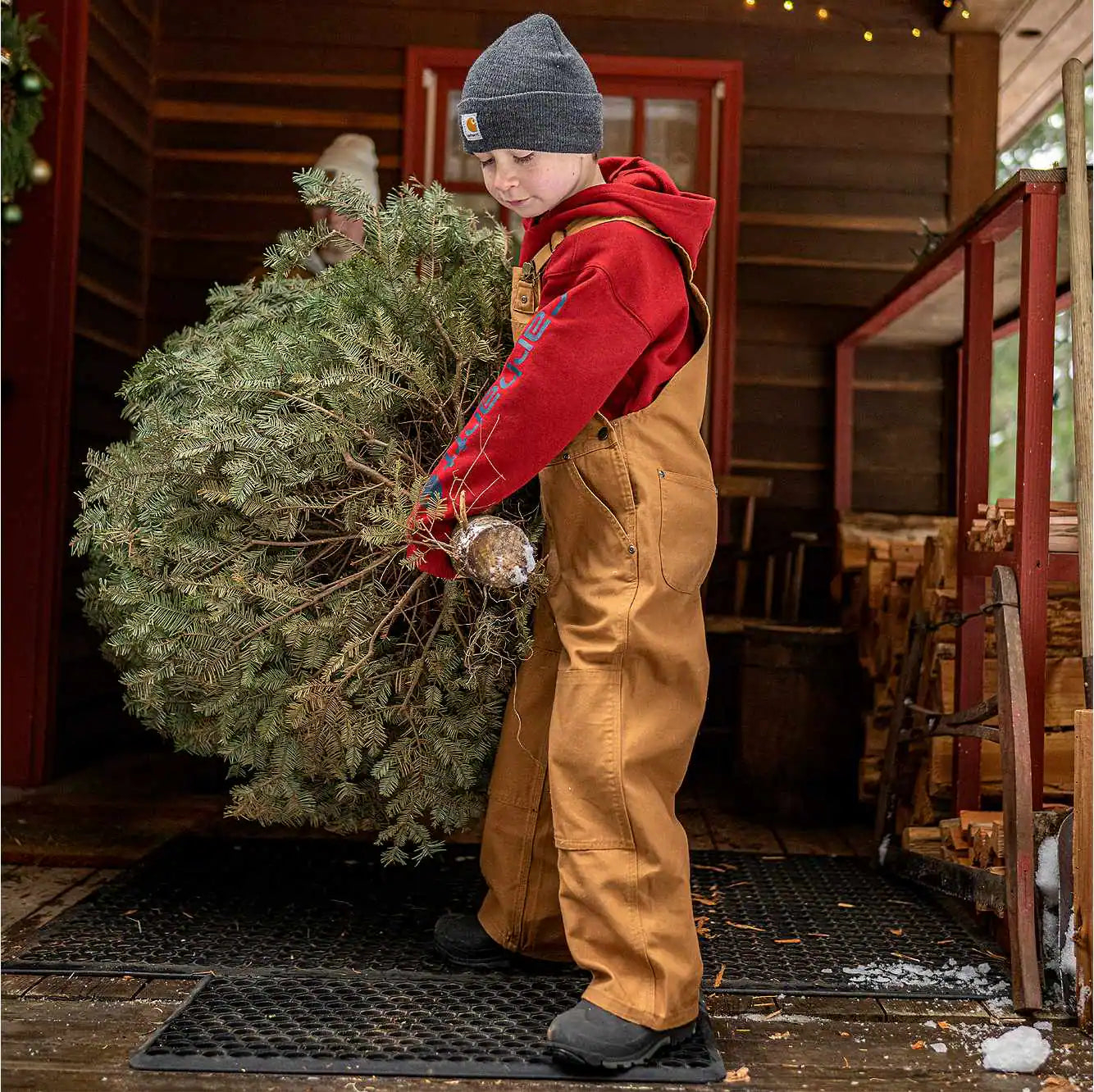 Functional and durable. These boys' bib overalls keep things simple and practical. Strong cotton canvas is built to last. Reinforced knees that can be cleaned out or hold knee pads will stand up to whatever he puts them through. Plenty of pockets give him places to stash his gear.