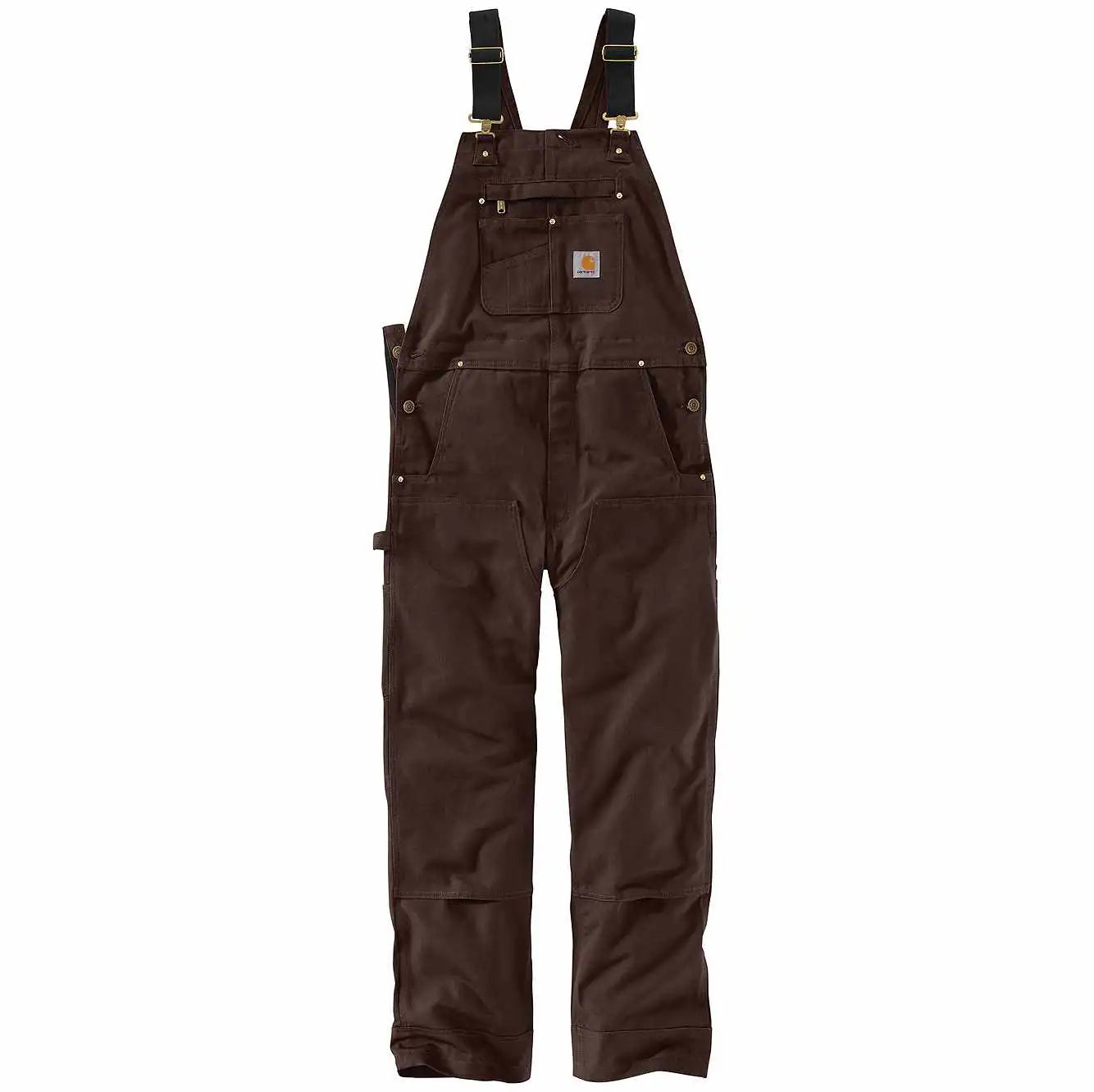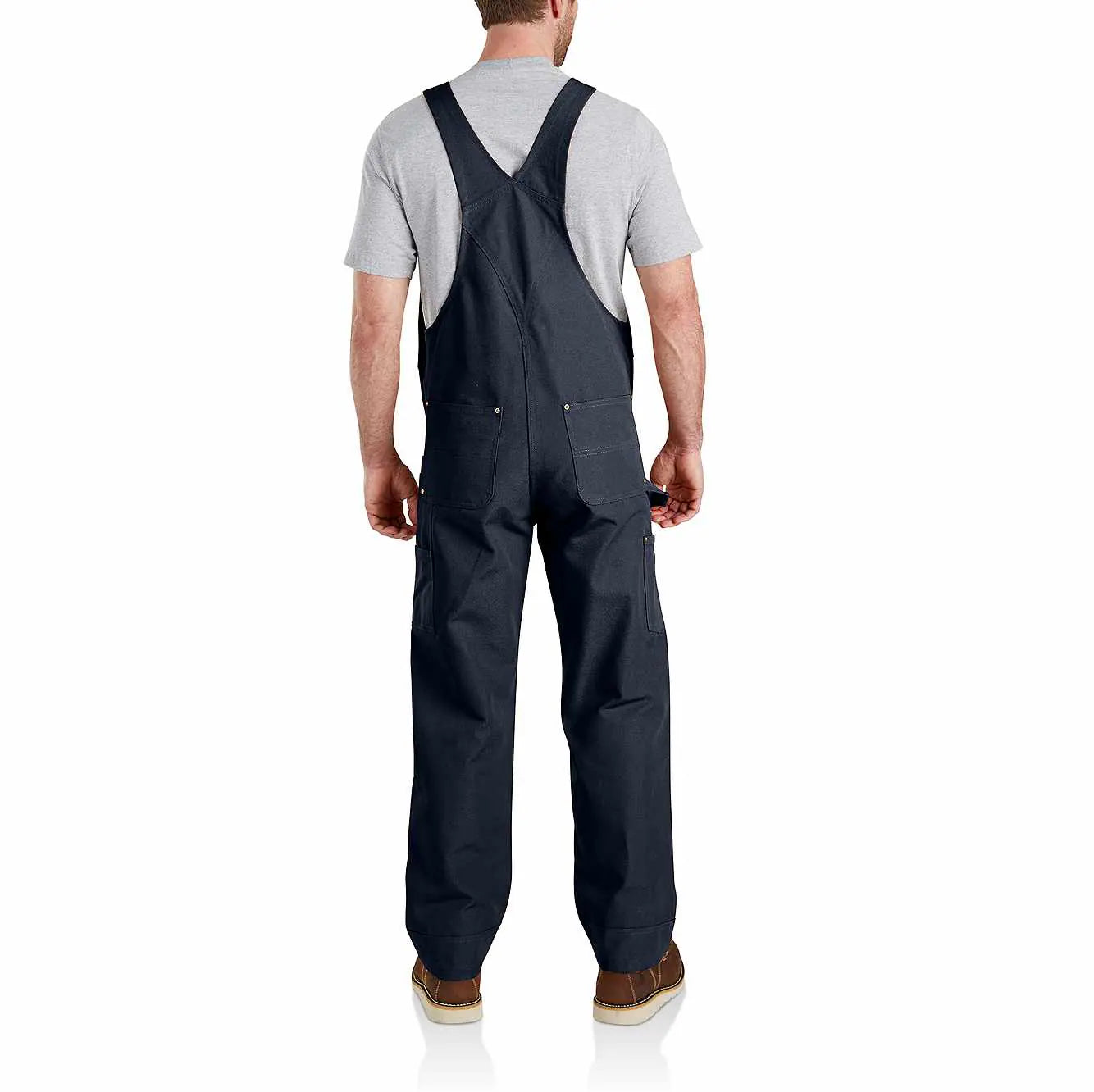 An update to our most popular unlined bib, the R01, these heavyweight men's bib overalls were designed using feedback from our Carhartt Crew. Every detail, from the front-to-back kick panel on the cuffs to the extra stretch around the waist, was informed by the hardworking people who wear our gear day-in and day-out. The heavyweight cotton duck material makes them dependable and durable. Elastic suspenders, a double layer at the knees, and ample pockets provide even more durability and functionality. Compatible with the Carhartt Knee Pad.