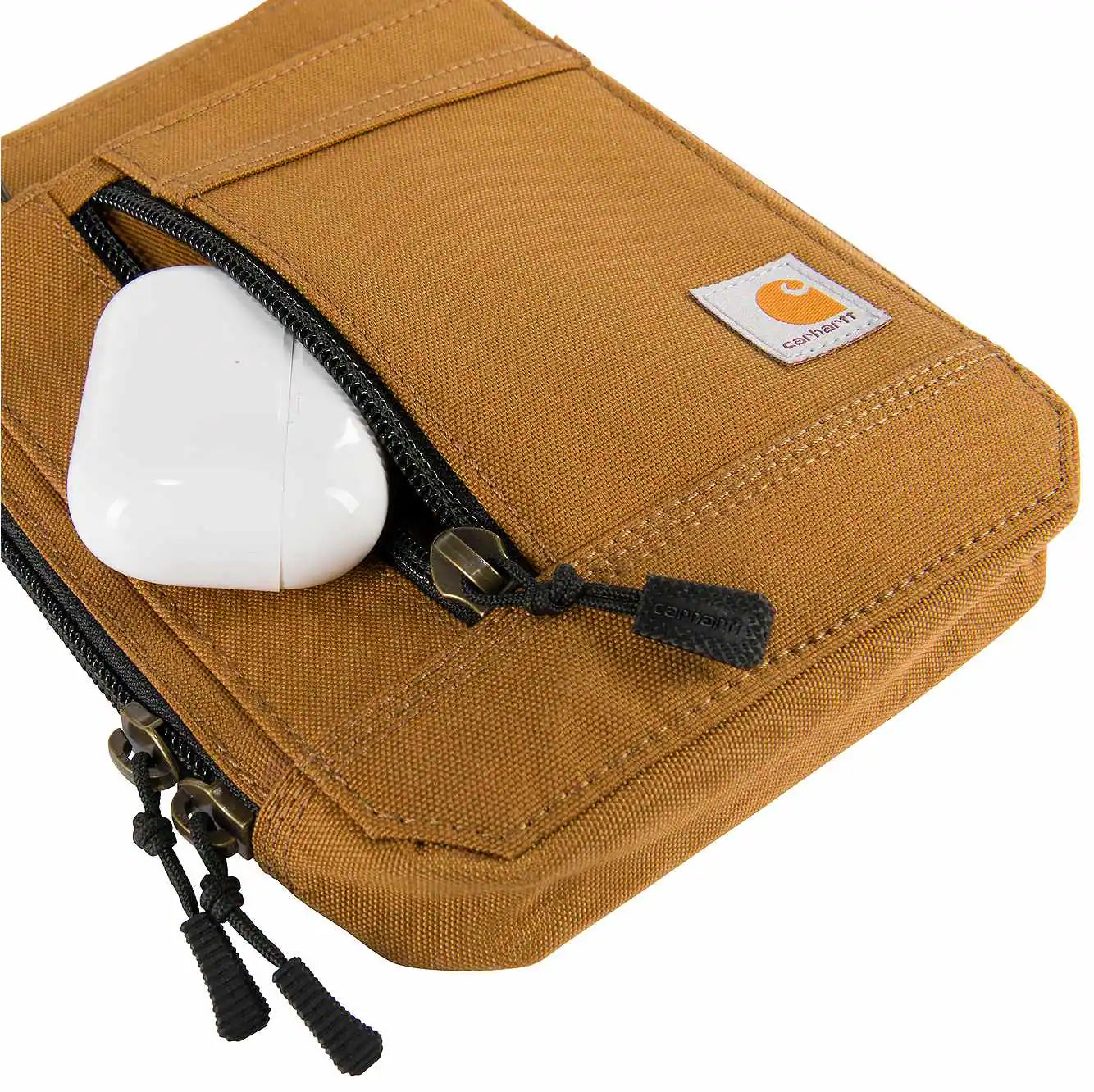 This crossbody wallet is made with durable CORDURA® 500-denier nylon and a water-resistant interior structure to keep the wallet shape in damp or wet conditions. It also features 2 front exterior pockets and 1 zippered pocket, 1 mesh ID window pocket and will fit all cell phones.