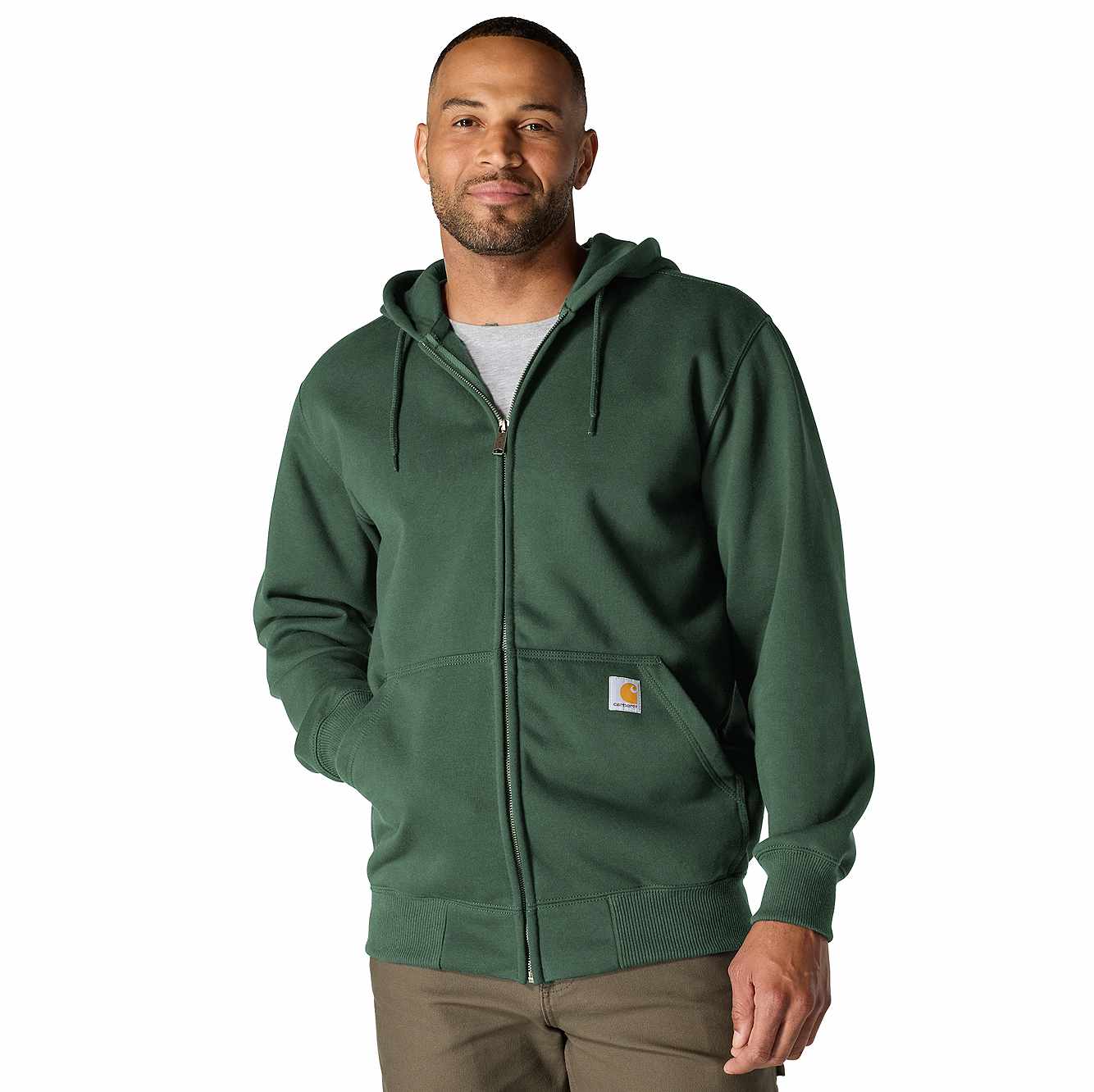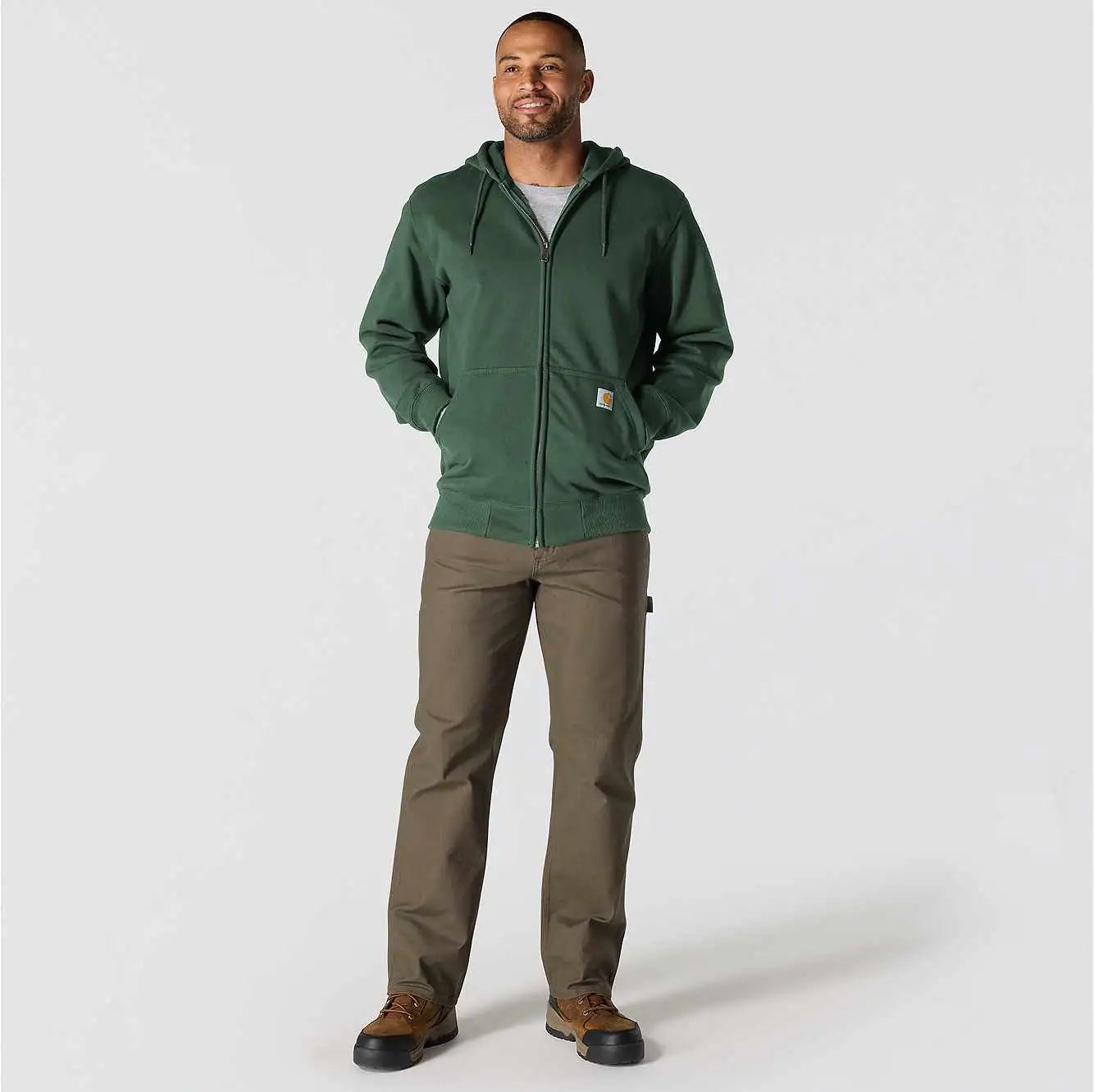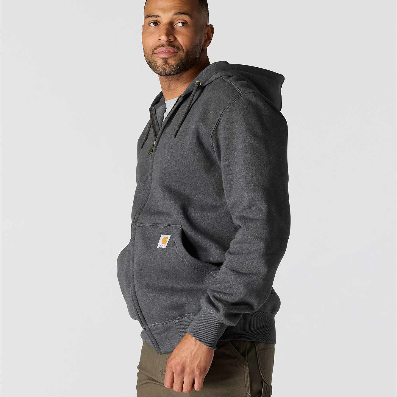 Don't let a little wet weather slow you down. This men's zip-hoodie gives you the familiar comfort of a favorite sweatshirt with the added benefit of keeping you dry in light rain. There's a hidden security pocket inside one of the two handwarmer pockets in the front. Previously known as the Rain Defender® Paxton Heavyweight Hooded Zip Front Sweatshirt