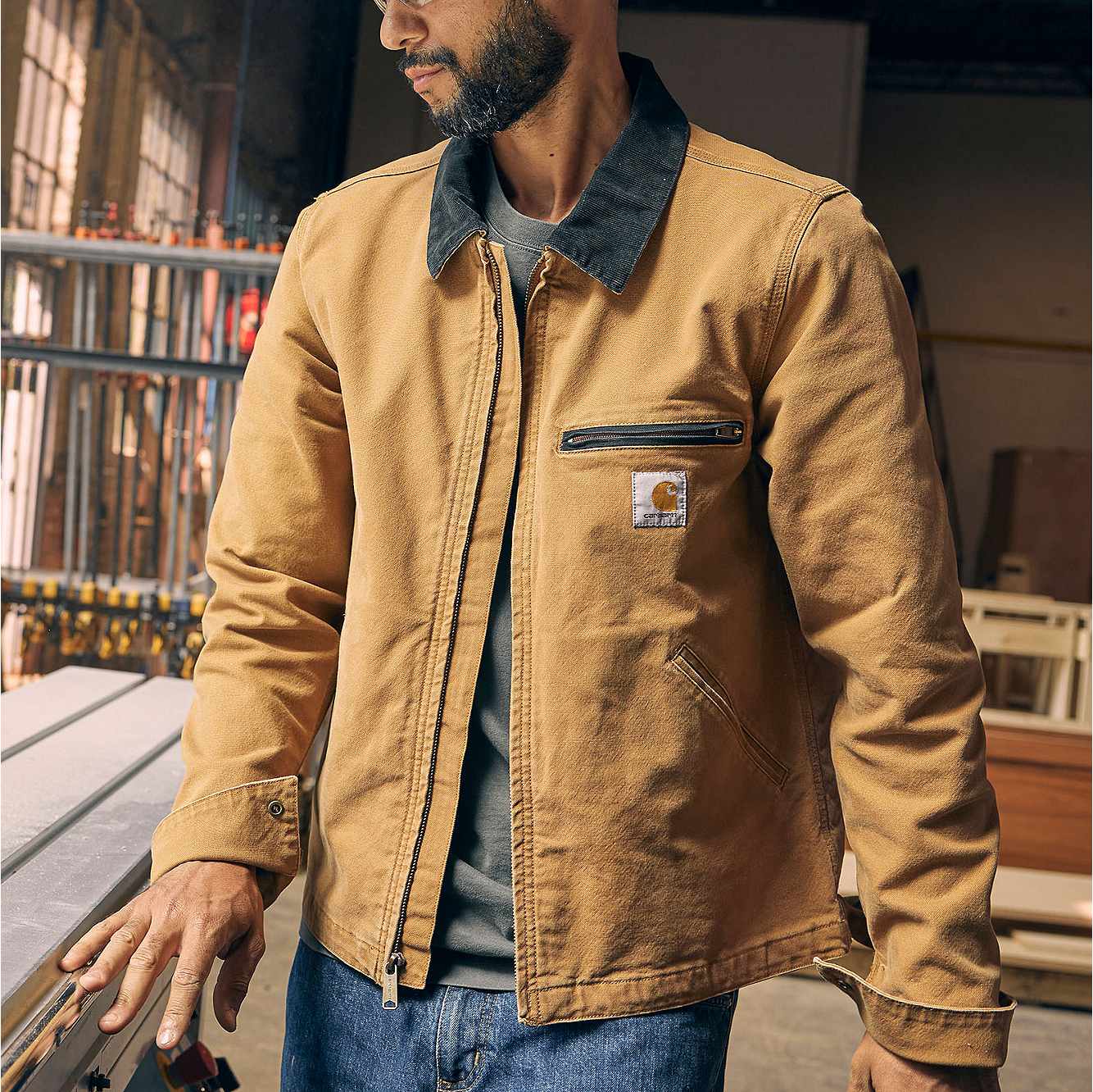 Inspired by legendary styles. From swapping fabrics to adjusting measurements, we've complemented one of our ur most classic styles with a more modern version. A Carhartt classic for over 70 years, the Detroit jacket takes a modern spin. This men's jacket reimagines the hardworking design with a lighter weight fabric for year round wear, a two-tone collar, and built-in flex that lets you move freely. Whether you're on the job or off the clock, rugged duck canvas provides durability, and a snap-adjustable hem lets you adjust the fit. Interior and exterior pockets keep your essentials close by.