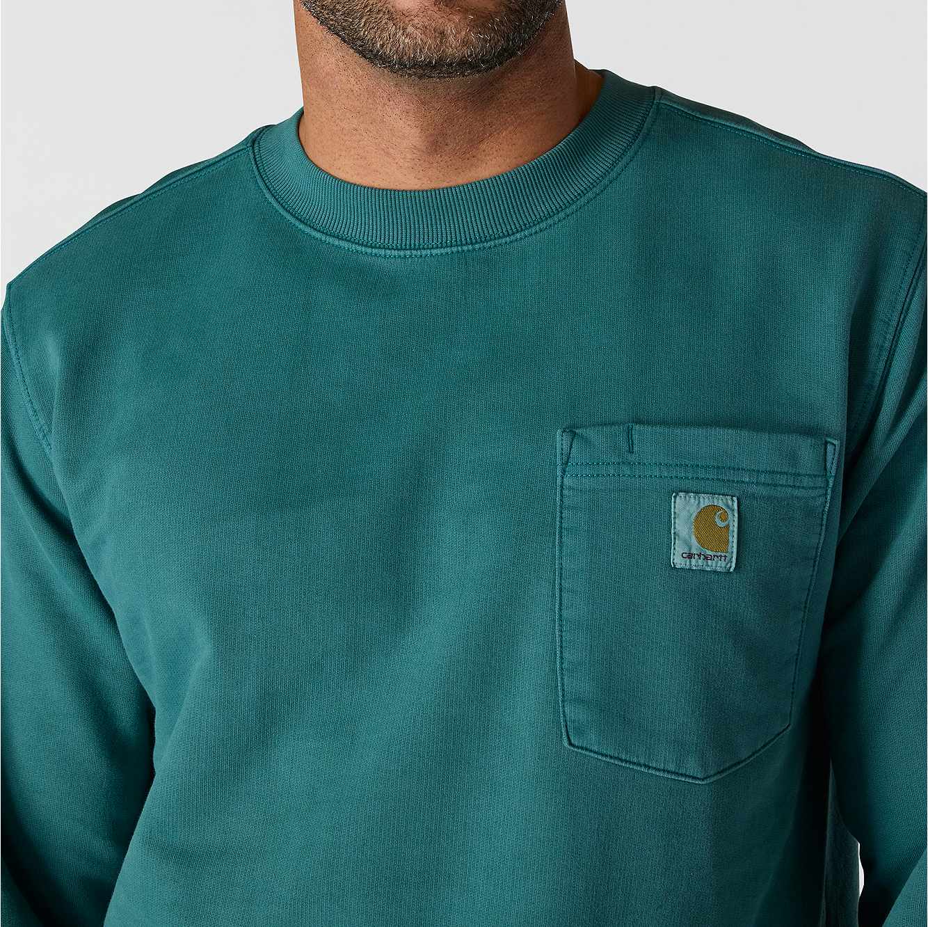 This men's French terry crewneck sweatshirt is garment-dyed for a worn-in, vintage look that only gets better with time. Built to last from midweight all-cotton French terry with a relaxed fit. Featuring a Carhartt label on the chest pocket.