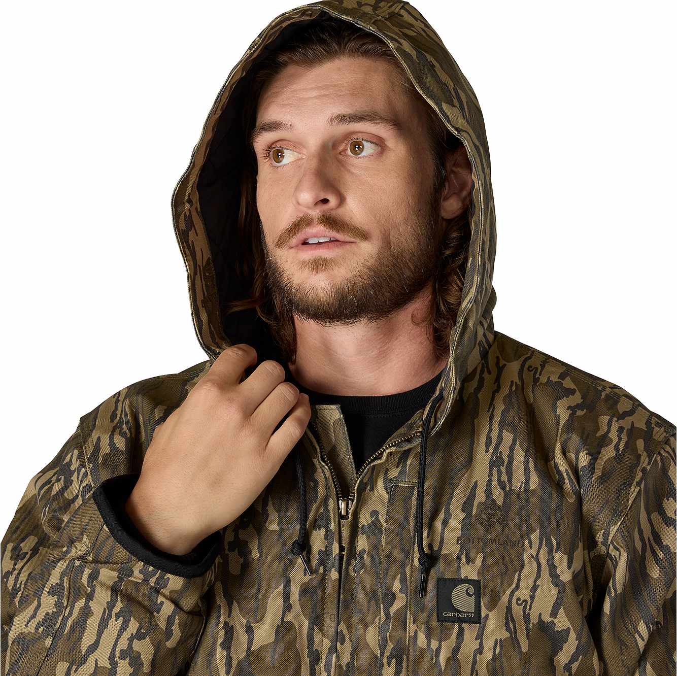 Stay warm and enjoy full mobility while you hunt or work in this men's Carhartt camo jac. The rugged duck canvas has built-in flex that lets you move and reach without feeling restricted. Whether you're setting up camp or working around the farm, it handles the wear and tear of the outdoors with reinforced sleeves and triple-stitched main seams. Quilted insulation seals in heat, and water-repellent technology keeps you dry in light rain. A loose fit offers room to layer and a comfortable fit.