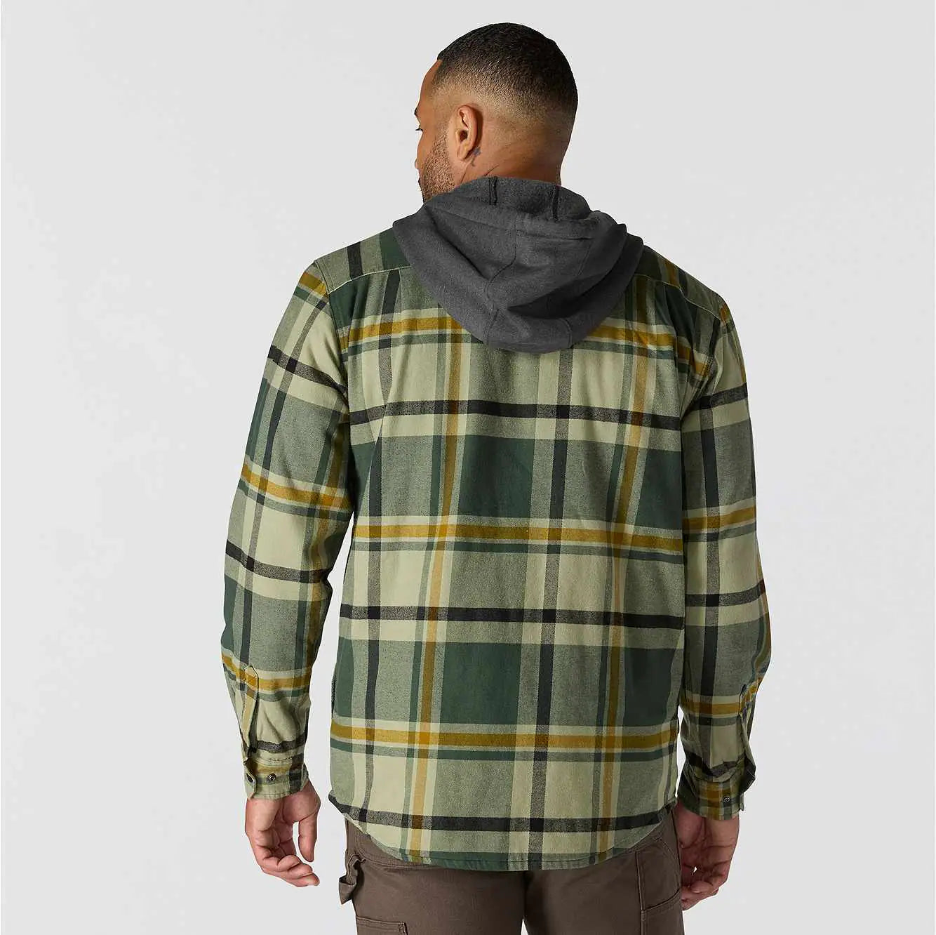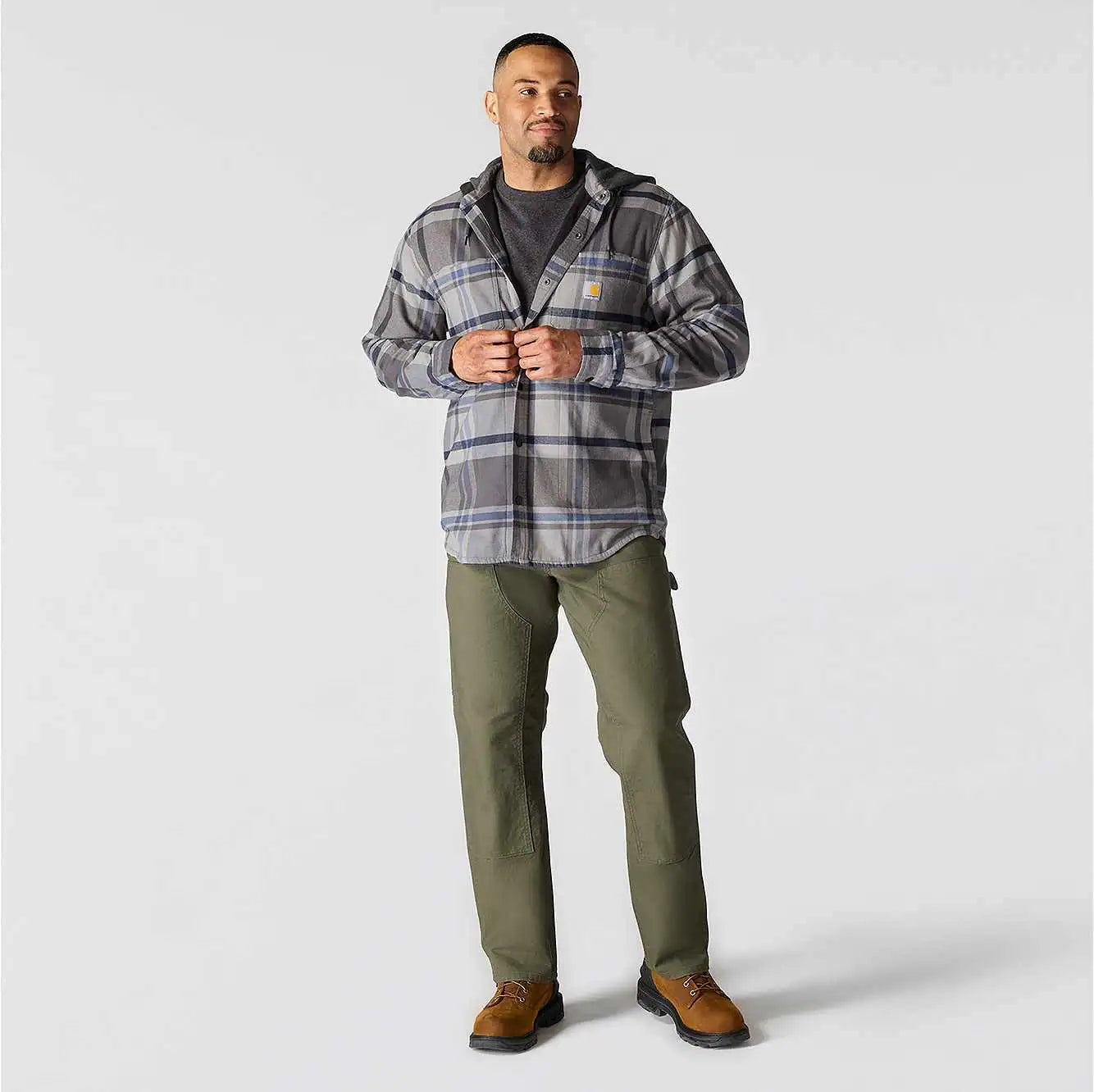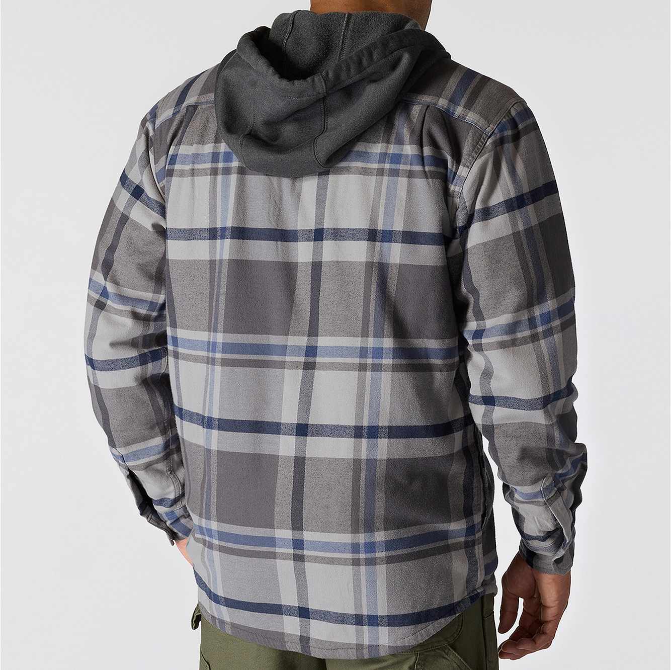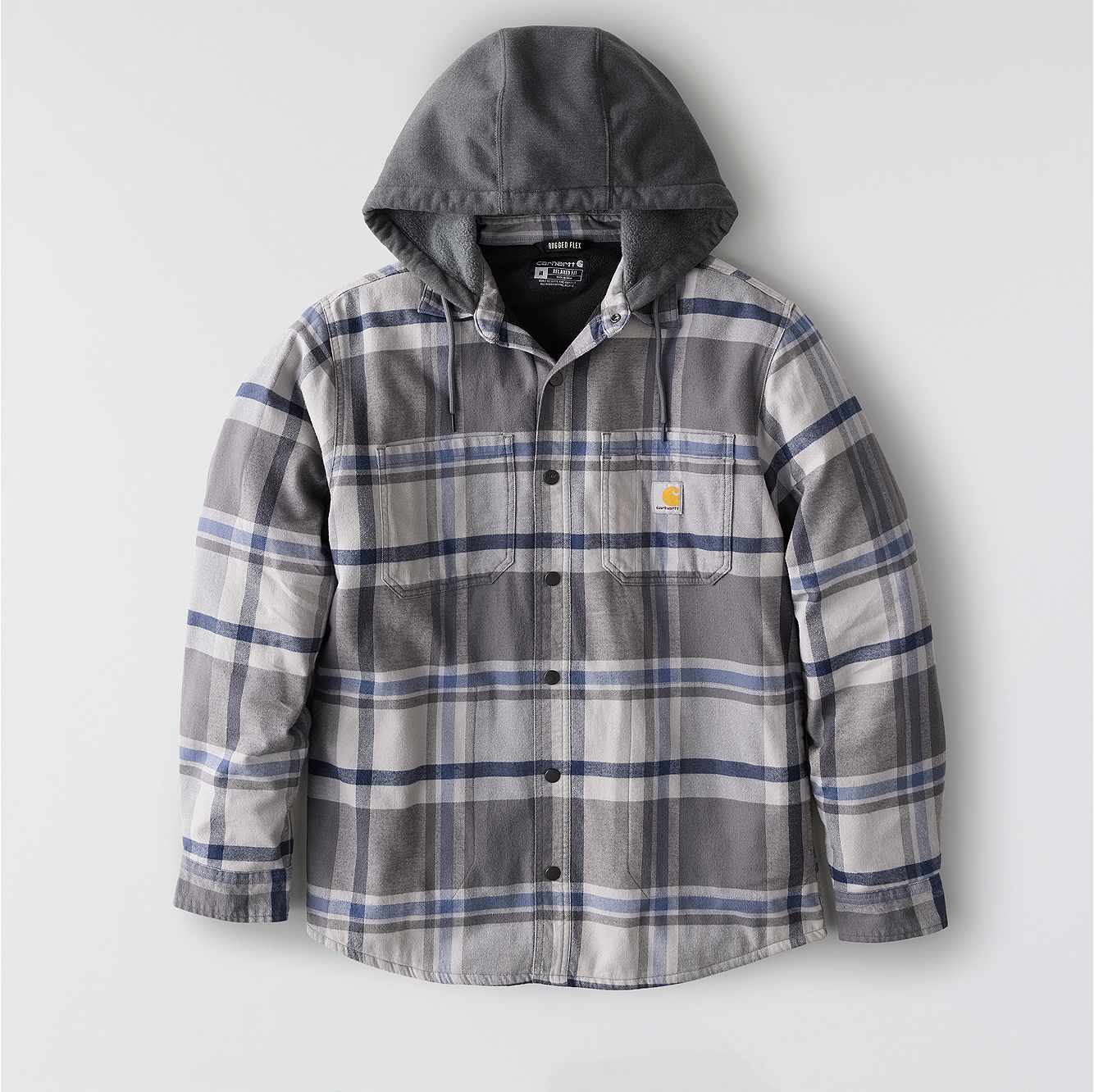 Stay warm while you work. This men's shirt jac is built for cold weather with a soft fleece lining and an attached hood. Stretch flannel and a relaxed fit allow you to lift boxes and swing a hammer with ease.