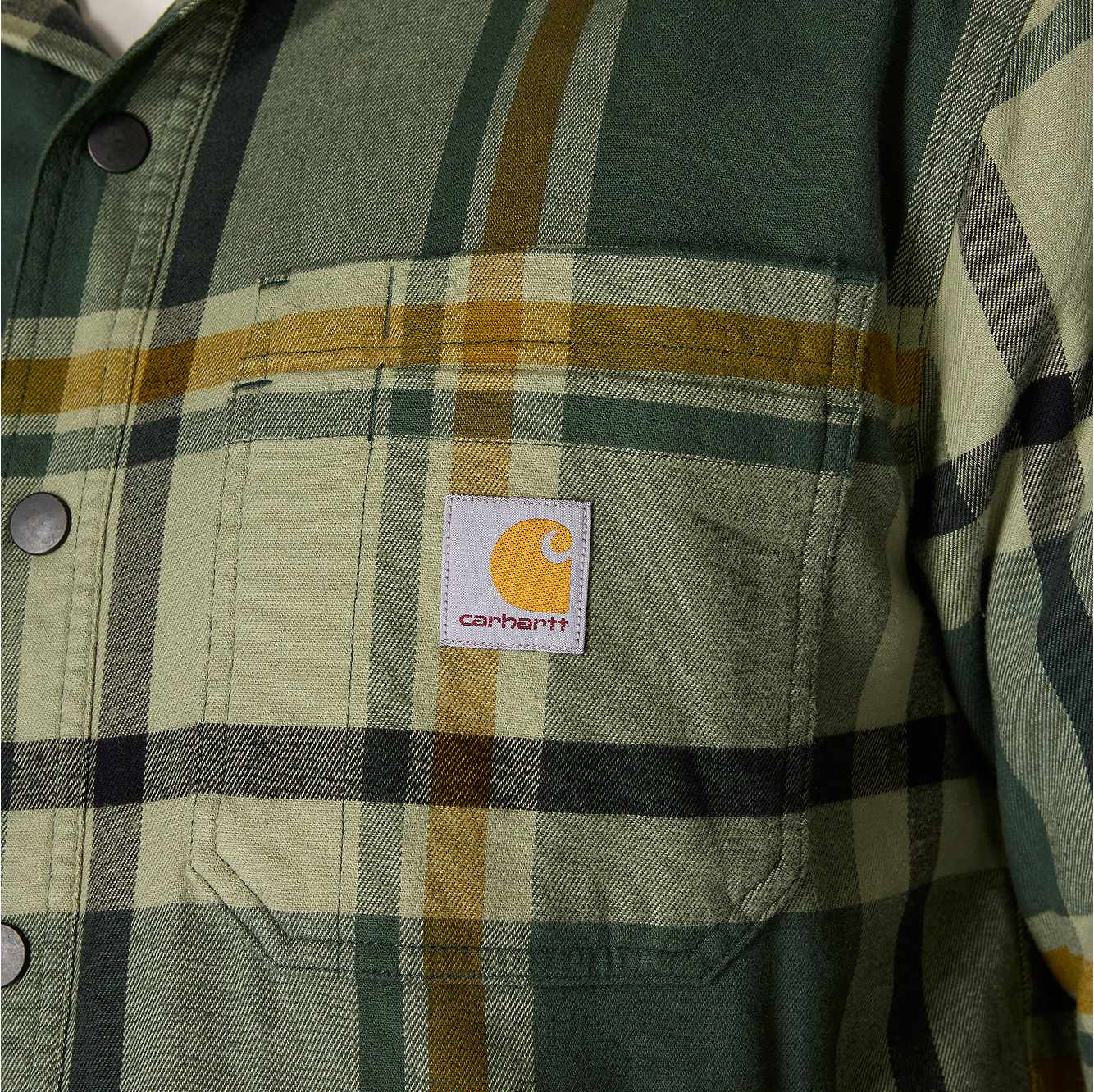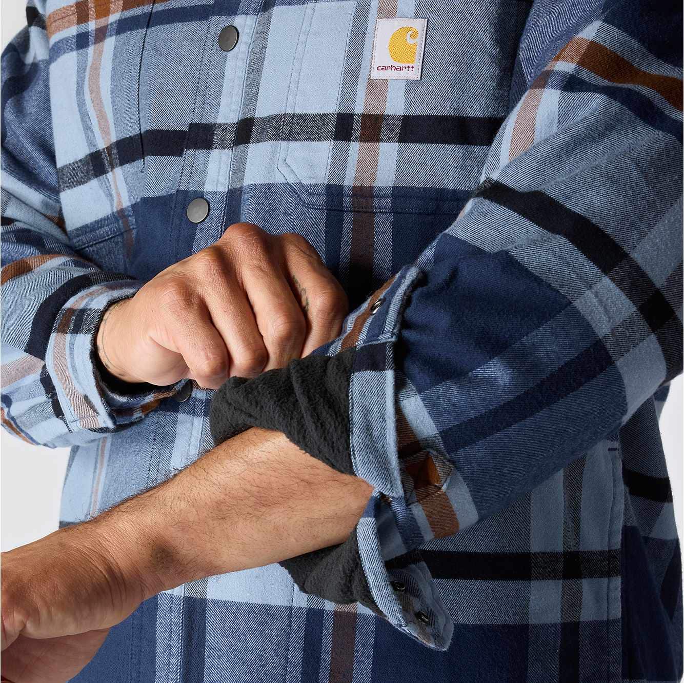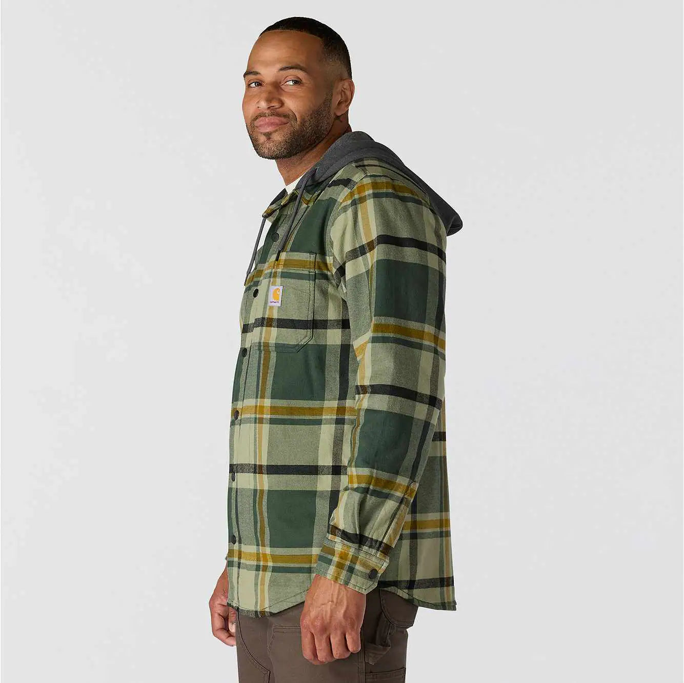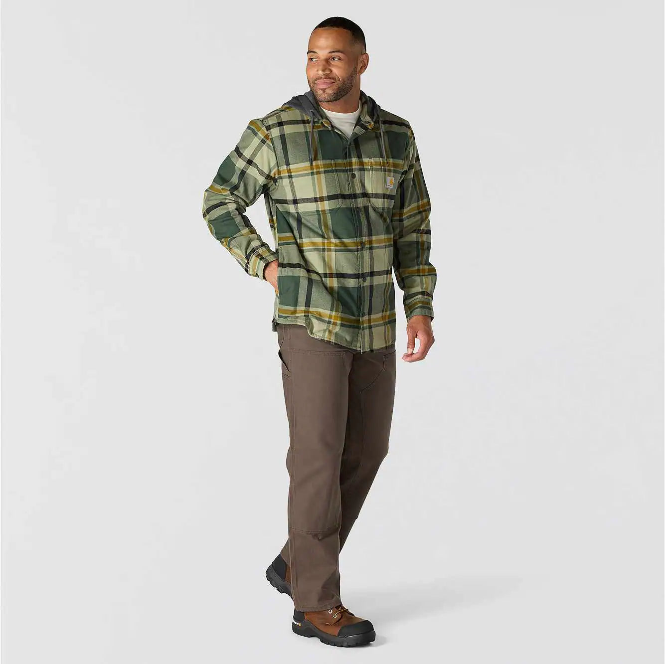 Stay warm while you work. This men's shirt jac is built for cold weather with a soft fleece lining and an attached hood. Stretch flannel and a relaxed fit allow you to lift boxes and swing a hammer with ease.