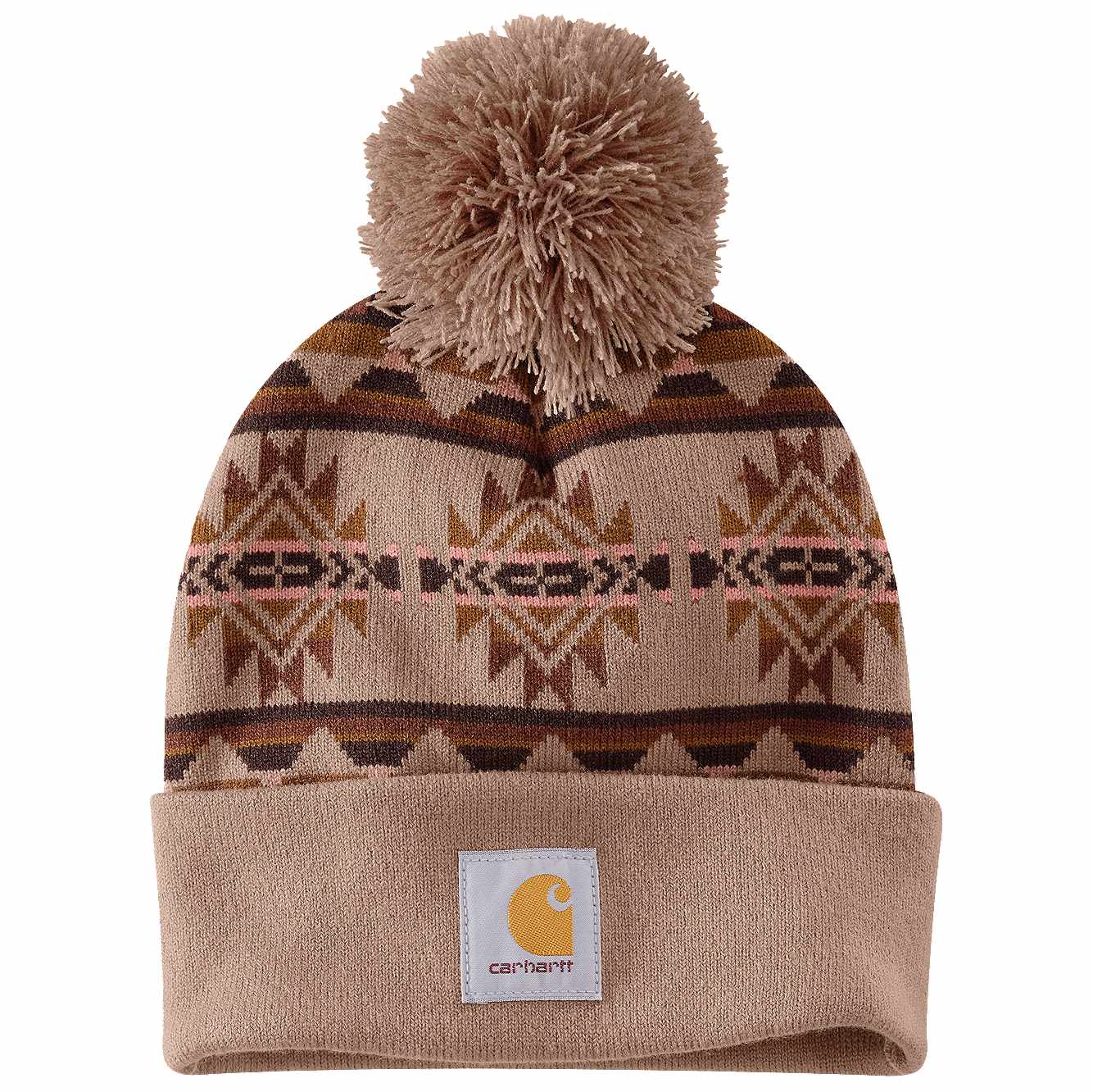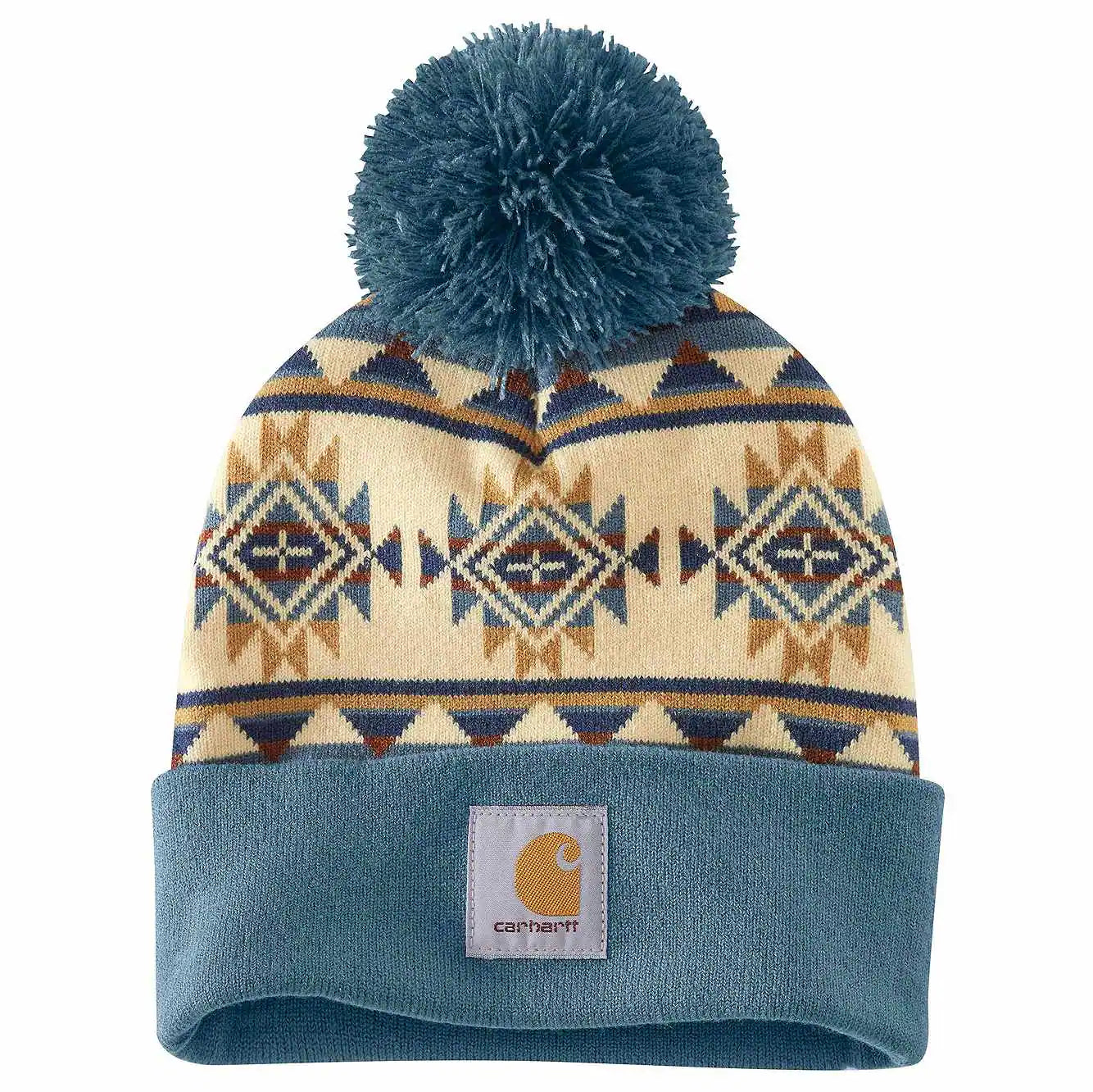A traditional women's pom pom beanie for cold days featuring a jacquard knit panel with an authentic pattern created by Bethany Yellowtail of the Northern Cheyenne and Crow Nations, a Native American woman-owned brand dedicated to sharing authentic Indigenous designs with the world. The soft acrylic rib-knit features a stretch fit to seal in warmth.