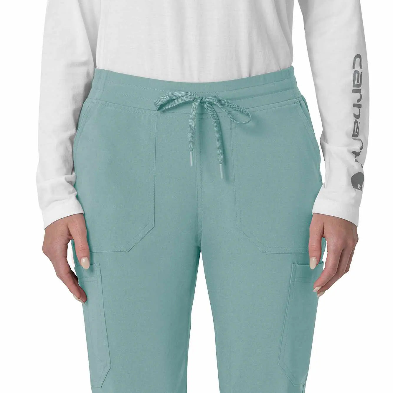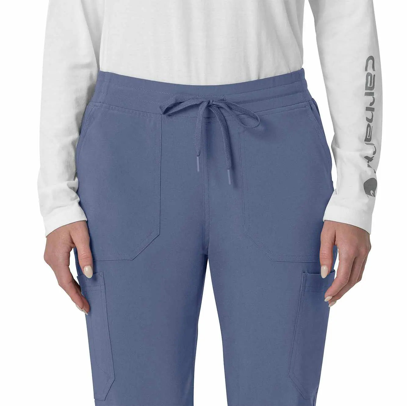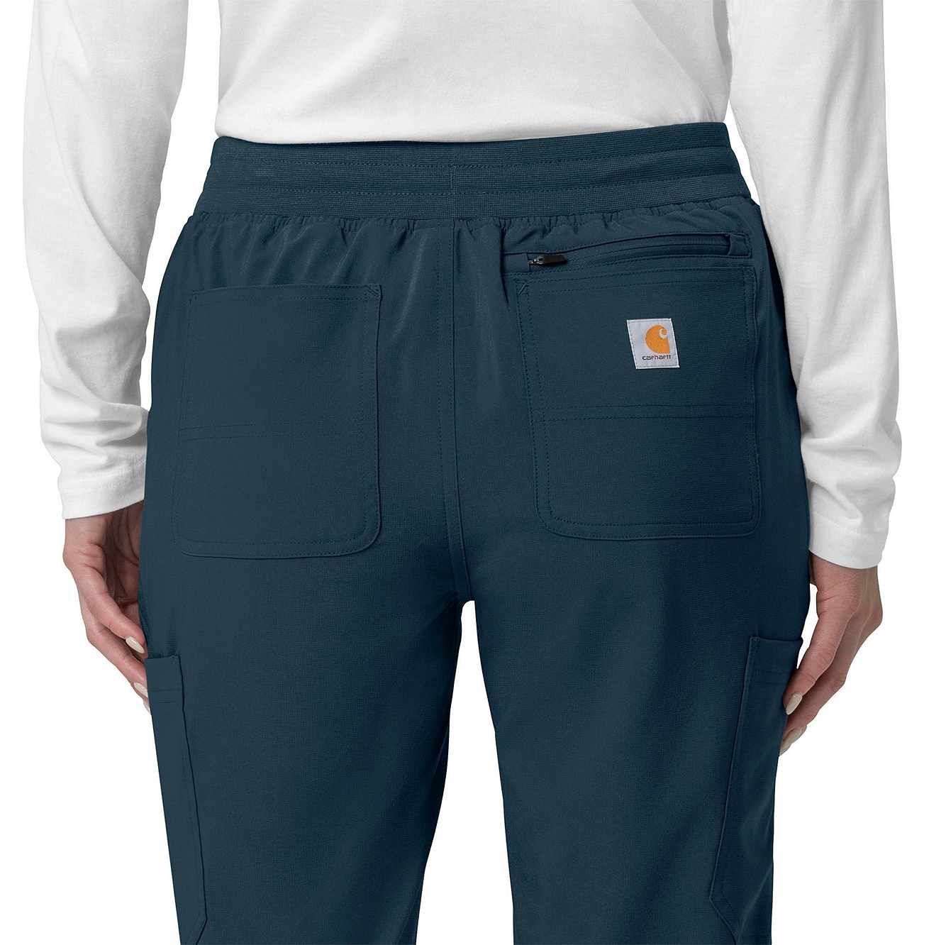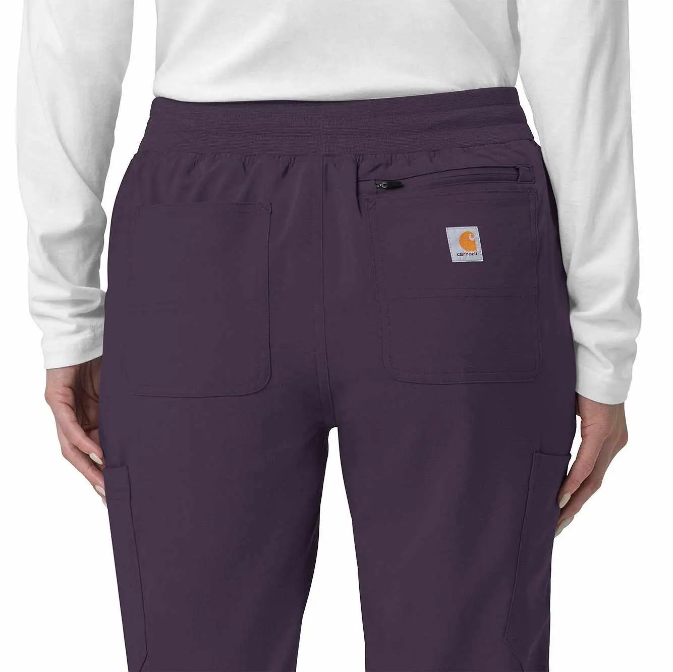The Carhartt Women's Cargo Jogger Scrub Pant – your dependable partner for demanding days in the medical field. Crafted from a durable and comfortable polyester spandex blend, these pants offer the flexibility you need to handle any task with ease. Whether you're pushing carts, adjusting equipment, or attending to patients, the built-in flex ensures you move freely and comfortably. The rib-knit comfort waistband with elastic and a full drawstring ensures a secure, no-pinch fit that won't dig in during long shifts. These jogger-style scrub pants feature a rib-knit cuff at the bottom for a stylish and secure fit. Stay organized with multiple pockets, including deep front slash pockets, cargo pockets with pen and cell phone slots, Carhartt-style back pockets, and a secure zip pocket with a mesh pocket bag. Your essentials are always within reach. With FastDry® technology to keep you cool and dry and Rugged Flex™ stretch technology for unrestricted movement, these scrubs from the Force Cross-Flex collection are designed to help you excel on every shift. Trust Carhartt for the durability and comfort you need in your medical uniform.