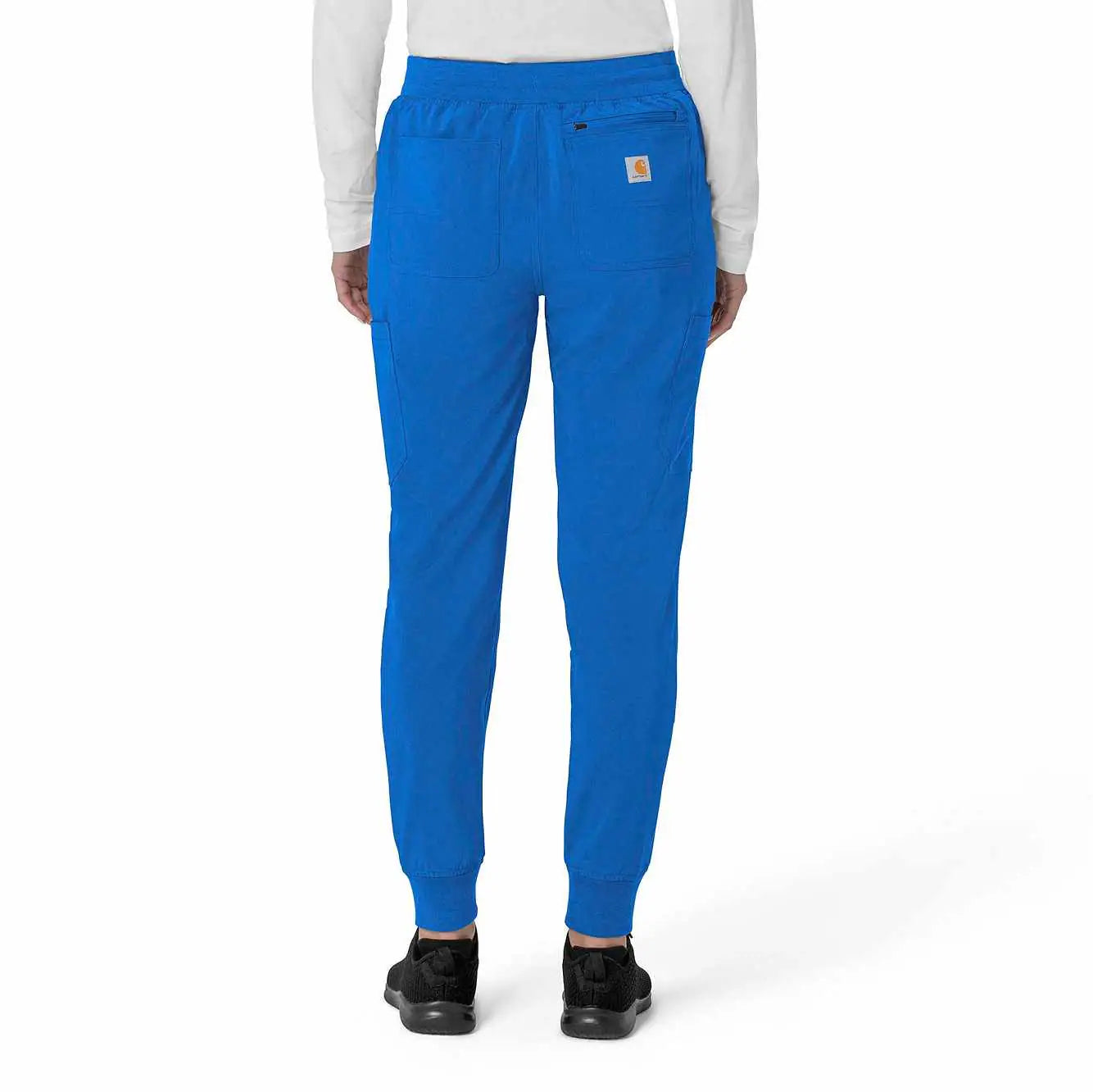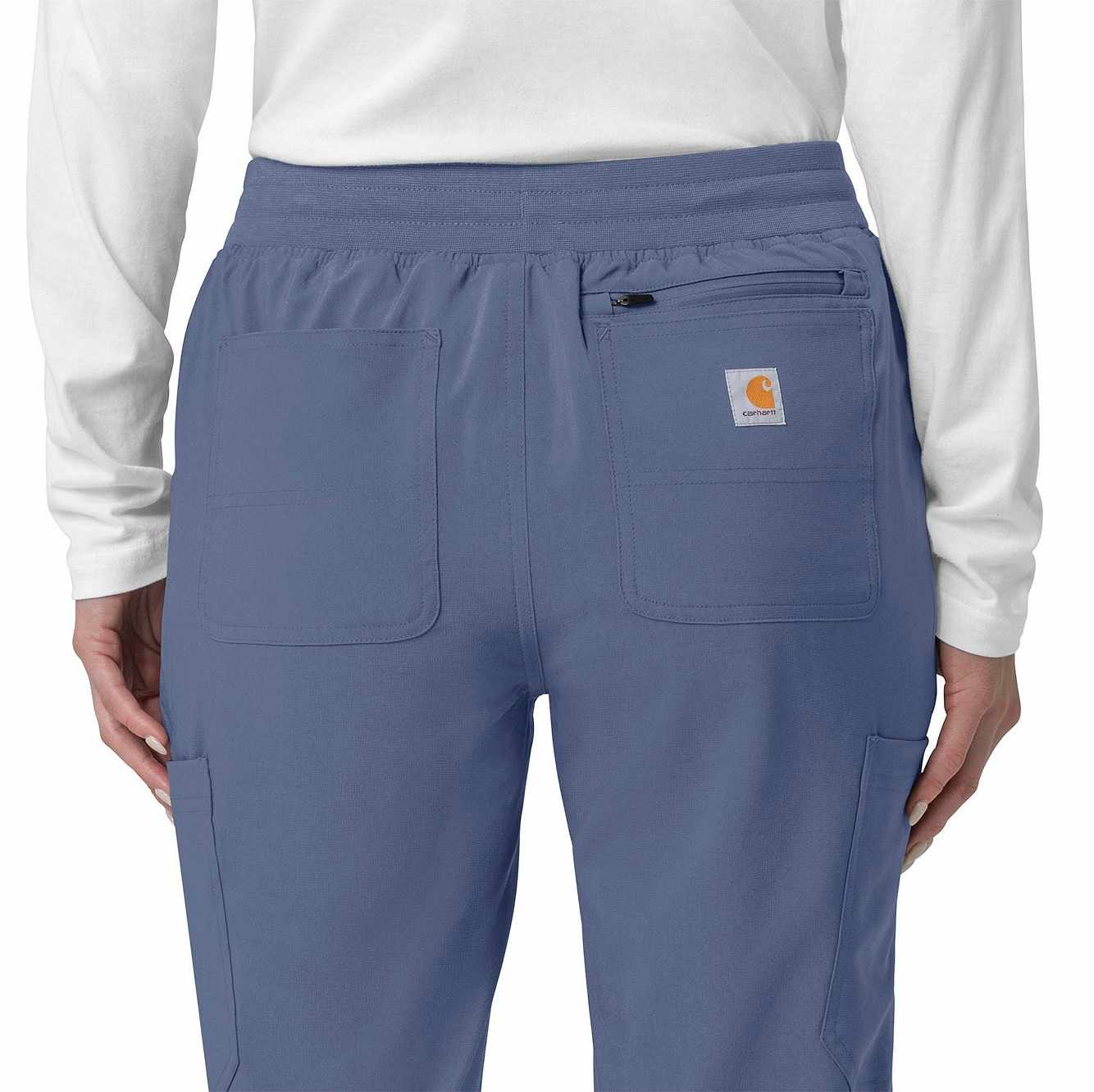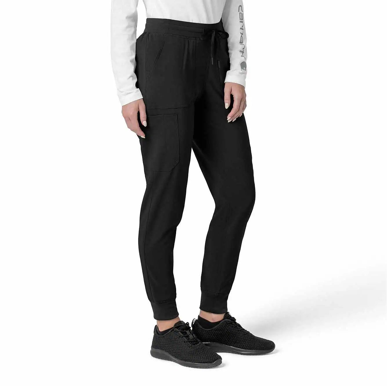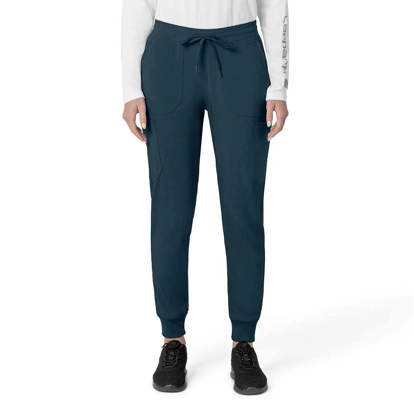The Carhartt Women's Cargo Jogger Scrub Pant – your dependable partner for demanding days in the medical field. Crafted from a durable and comfortable polyester spandex blend, these pants offer the flexibility you need to handle any task with ease. Whether you're pushing carts, adjusting equipment, or attending to patients, the built-in flex ensures you move freely and comfortably. The rib-knit comfort waistband with elastic and a full drawstring ensures a secure, no-pinch fit that won't dig in during long shifts. These jogger-style scrub pants feature a rib-knit cuff at the bottom for a stylish and secure fit. Stay organized with multiple pockets, including deep front slash pockets, cargo pockets with pen and cell phone slots, Carhartt-style back pockets, and a secure zip pocket with a mesh pocket bag. Your essentials are always within reach. With FastDry® technology to keep you cool and dry and Rugged Flex™ stretch technology for unrestricted movement, these scrubs from the Force Cross-Flex collection are designed to help you excel on every shift. Trust Carhartt for the durability and comfort you need in your medical uniform.