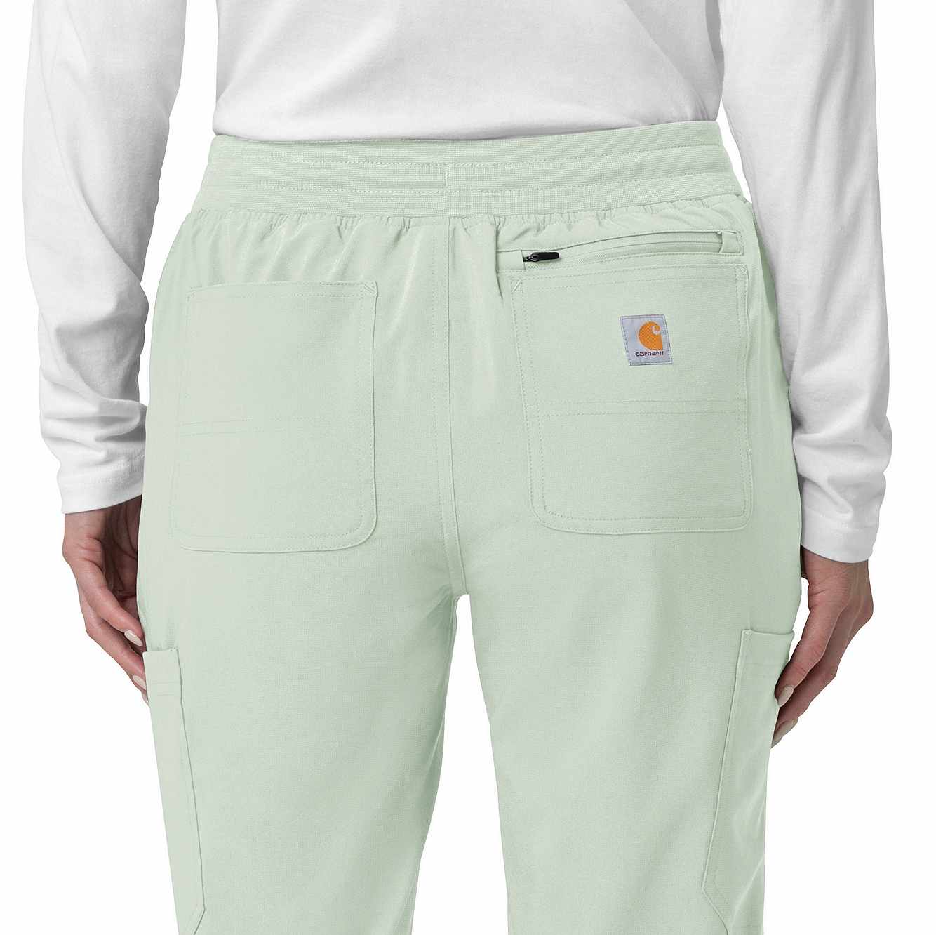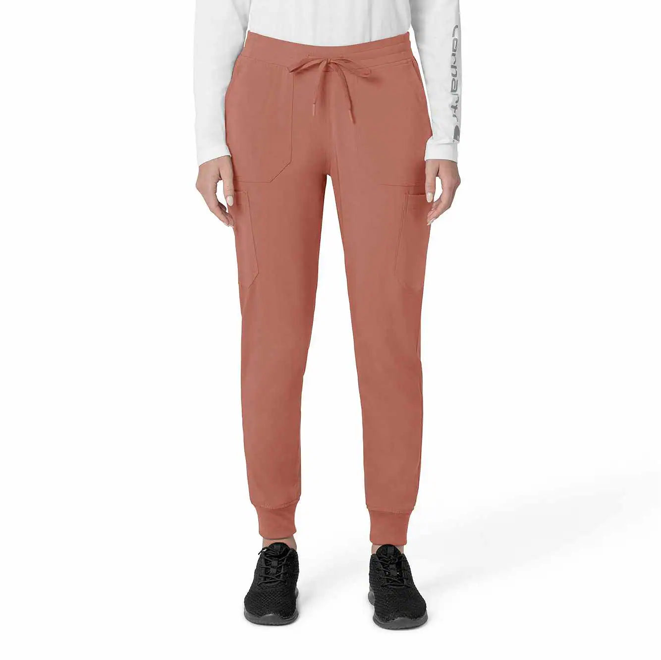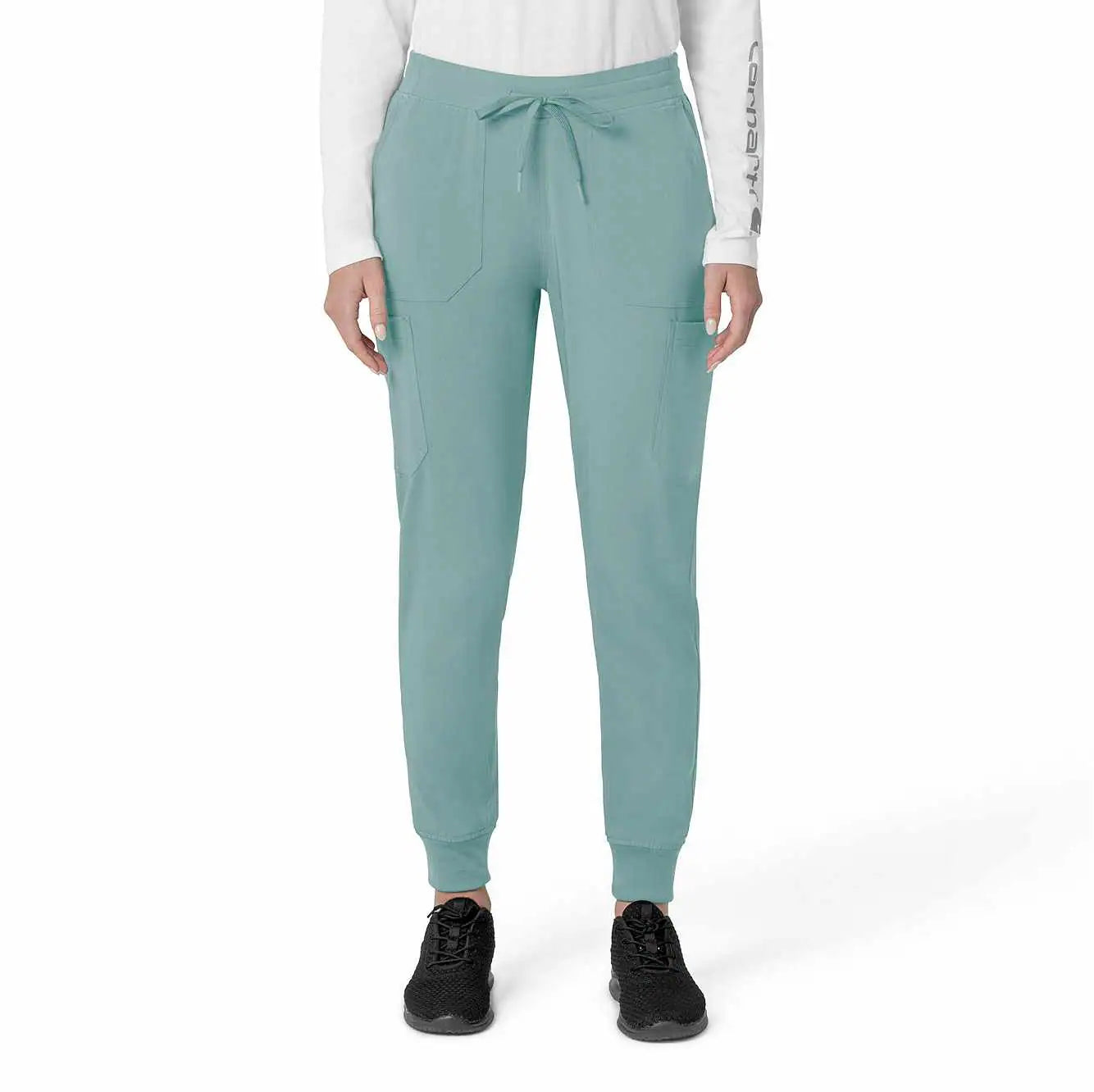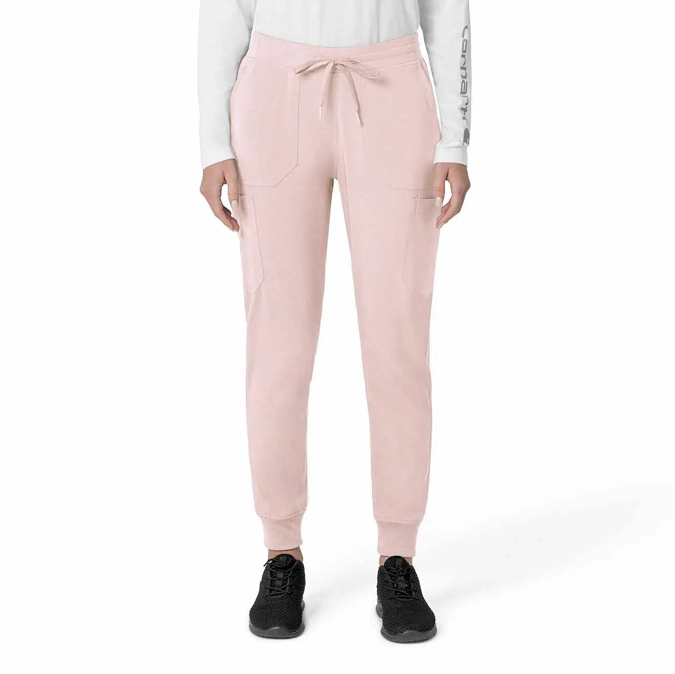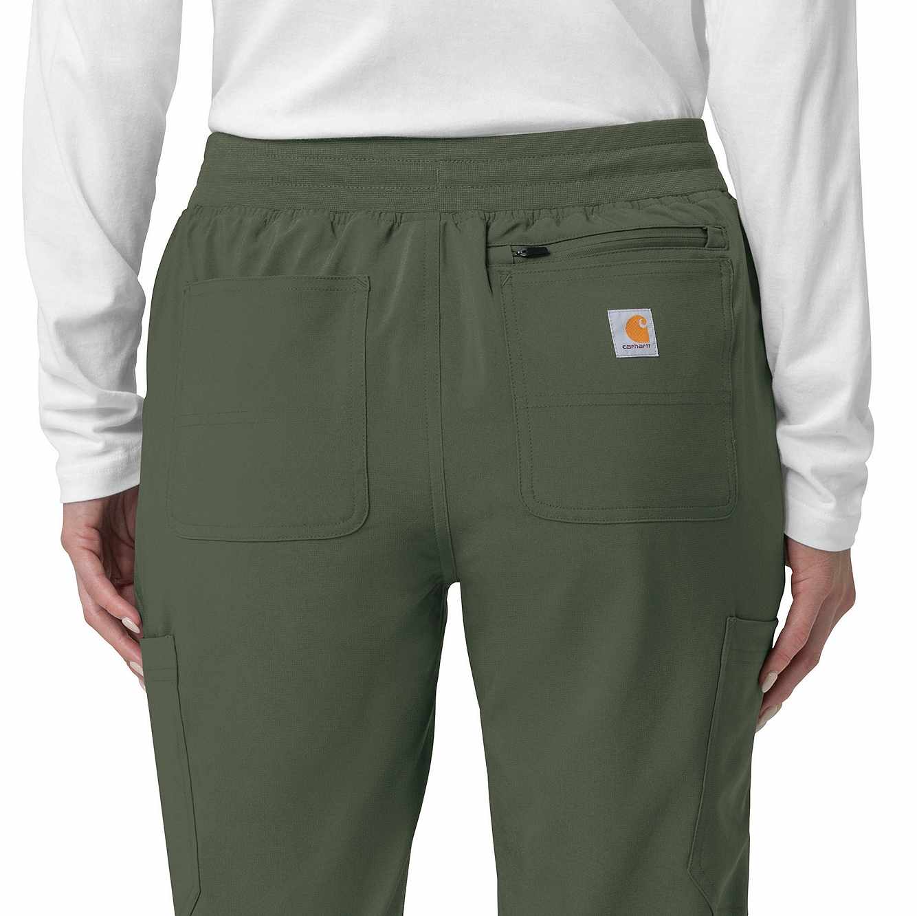 The Carhartt Women's Cargo Jogger Scrub Pant – your dependable partner for demanding days in the medical field. Crafted from a durable and comfortable polyester spandex blend, these pants offer the flexibility you need to handle any task with ease. Whether you're pushing carts, adjusting equipment, or attending to patients, the built-in flex ensures you move freely and comfortably. The rib-knit comfort waistband with elastic and a full drawstring ensures a secure, no-pinch fit that won't dig in during long shifts. These jogger-style scrub pants feature a rib-knit cuff at the bottom for a stylish and secure fit. Stay organized with multiple pockets, including deep front slash pockets, cargo pockets with pen and cell phone slots, Carhartt-style back pockets, and a secure zip pocket with a mesh pocket bag. Your essentials are always within reach. With FastDry® technology to keep you cool and dry and Rugged Flex™ stretch technology for unrestricted movement, these scrubs from the Force Cross-Flex collection are designed to help you excel on every shift. Trust Carhartt for the durability and comfort you need in your medical uniform.