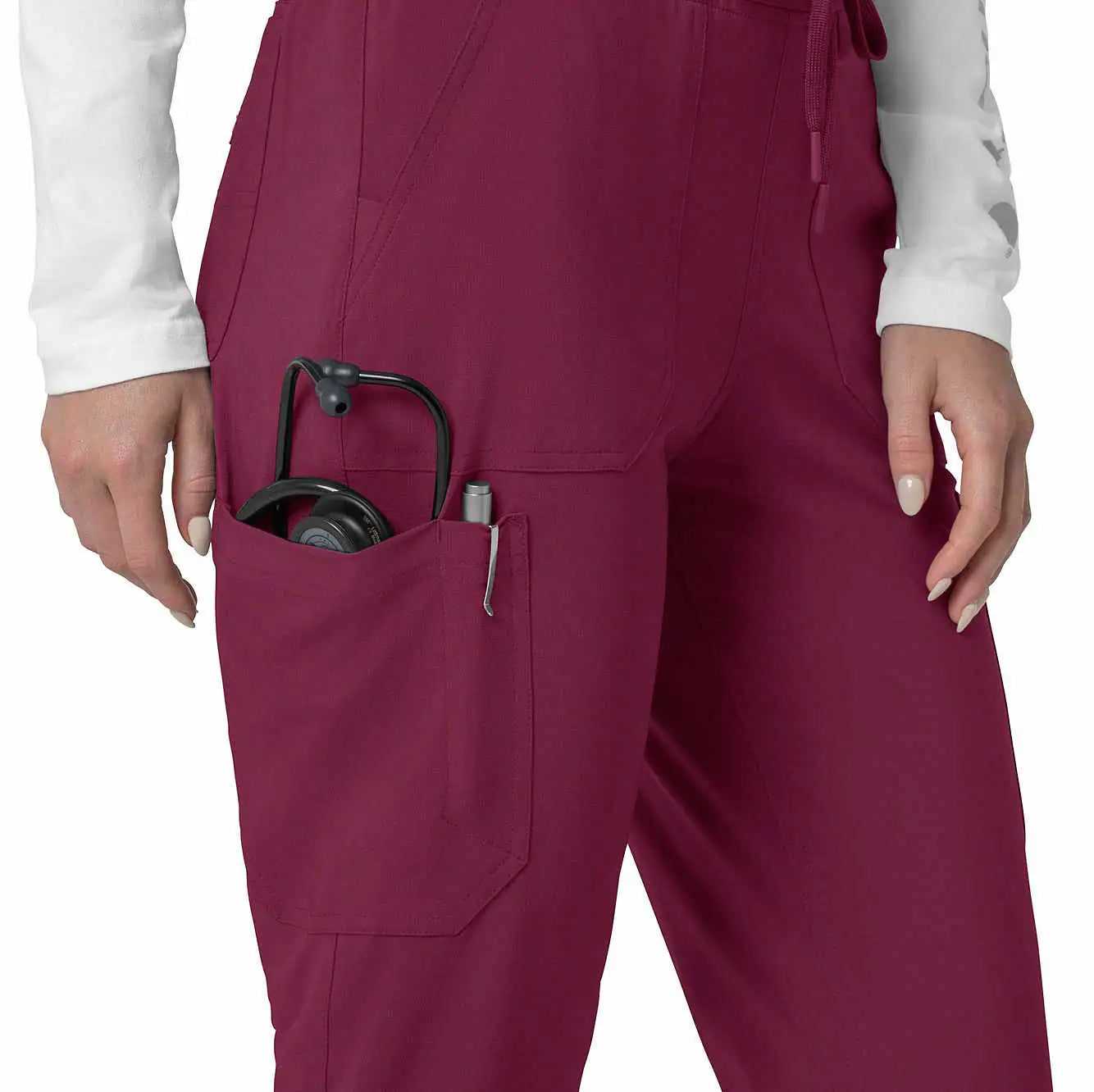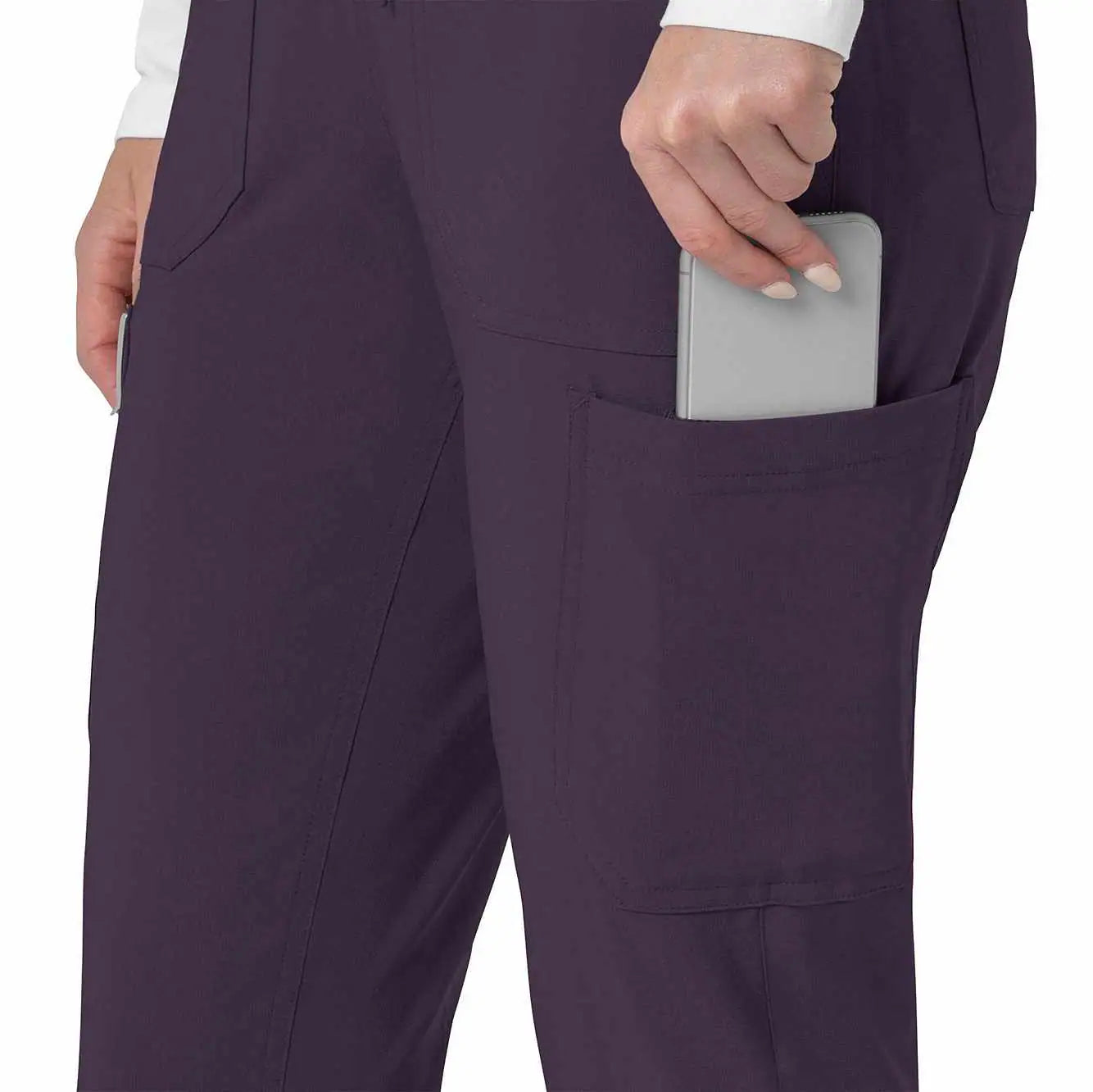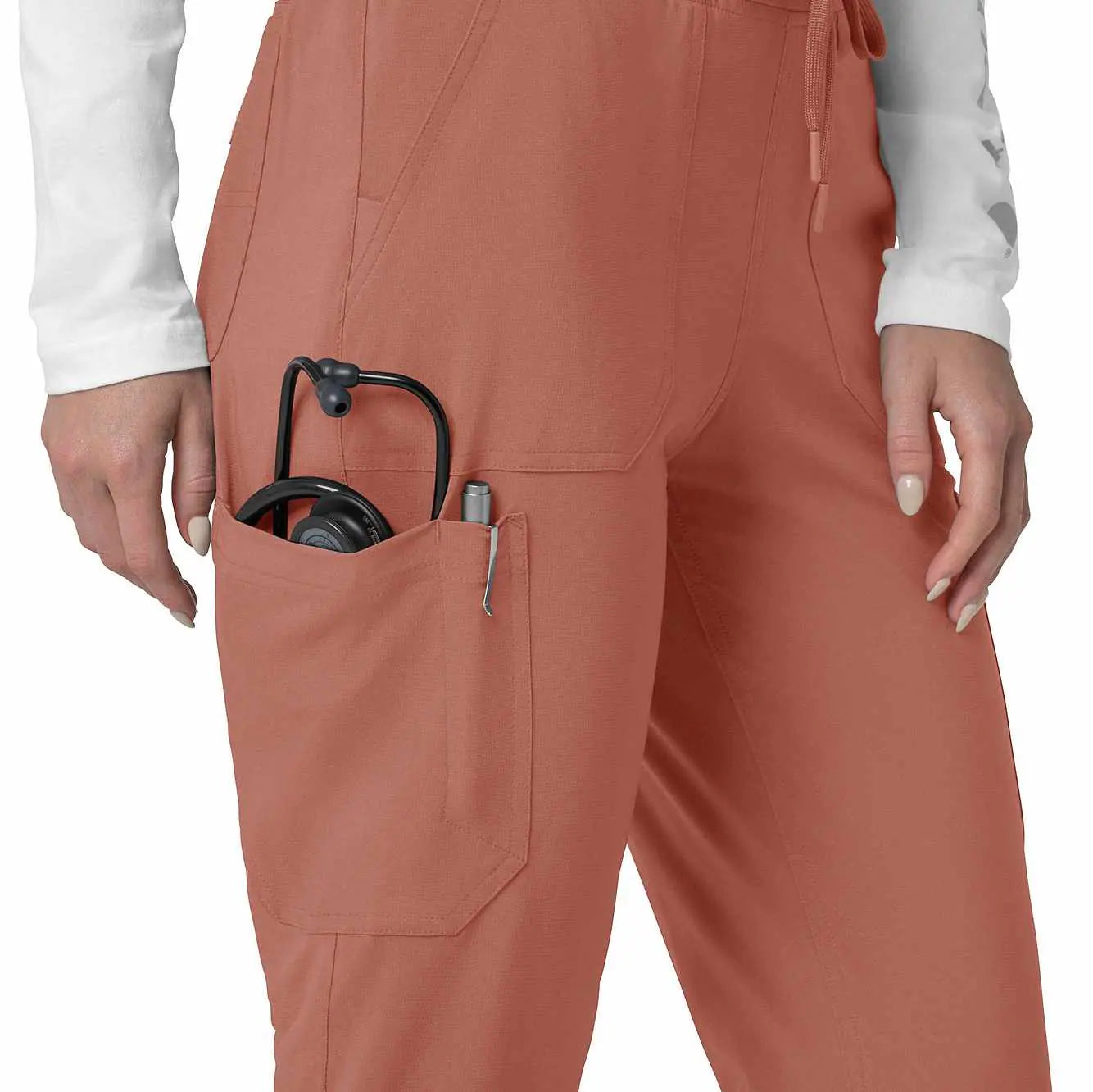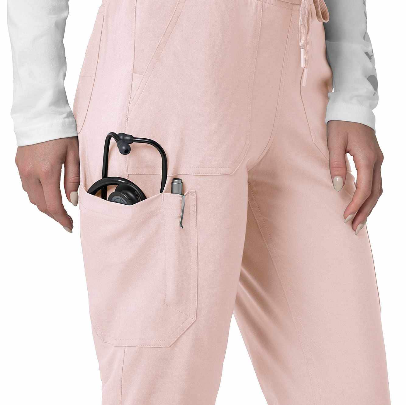 The Carhartt Women's Cargo Jogger Scrub Pant – your dependable partner for demanding days in the medical field. Crafted from a durable and comfortable polyester spandex blend, these pants offer the flexibility you need to handle any task with ease. Whether you're pushing carts, adjusting equipment, or attending to patients, the built-in flex ensures you move freely and comfortably. The rib-knit comfort waistband with elastic and a full drawstring ensures a secure, no-pinch fit that won't dig in during long shifts. These jogger-style scrub pants feature a rib-knit cuff at the bottom for a stylish and secure fit. Stay organized with multiple pockets, including deep front slash pockets, cargo pockets with pen and cell phone slots, Carhartt-style back pockets, and a secure zip pocket with a mesh pocket bag. Your essentials are always within reach. With FastDry® technology to keep you cool and dry and Rugged Flex™ stretch technology for unrestricted movement, these scrubs from the Force Cross-Flex collection are designed to help you excel on every shift. Trust Carhartt for the durability and comfort you need in your medical uniform.