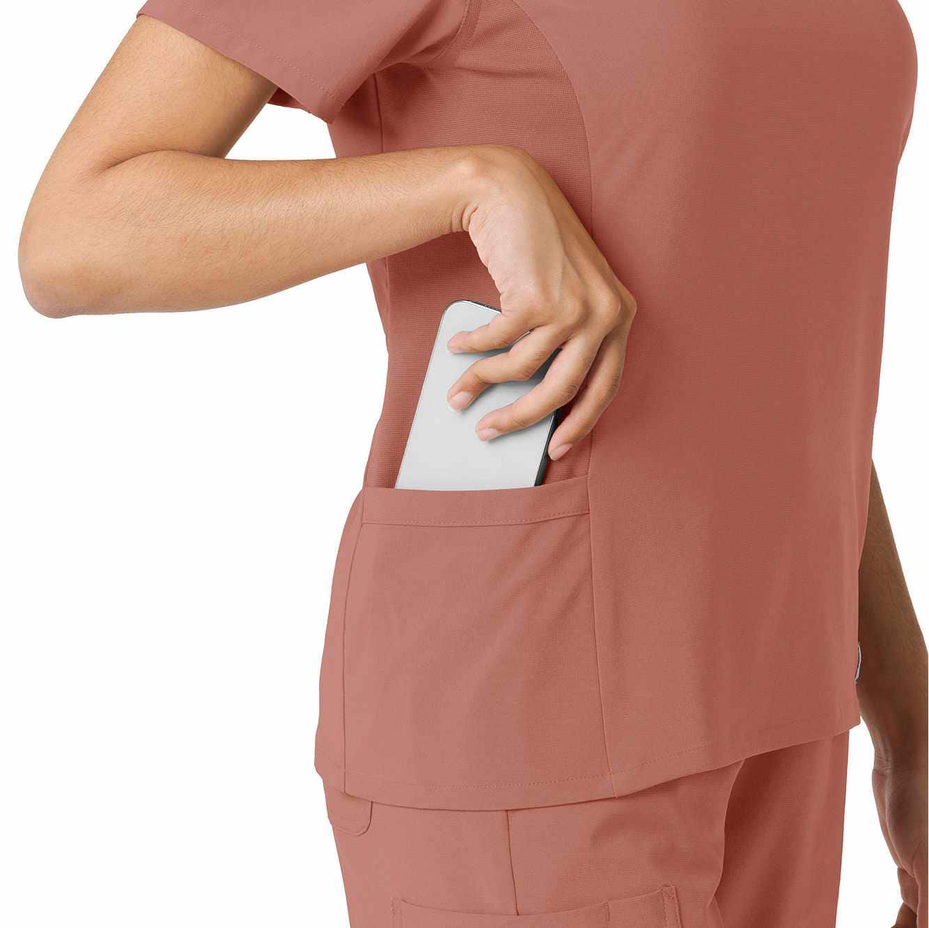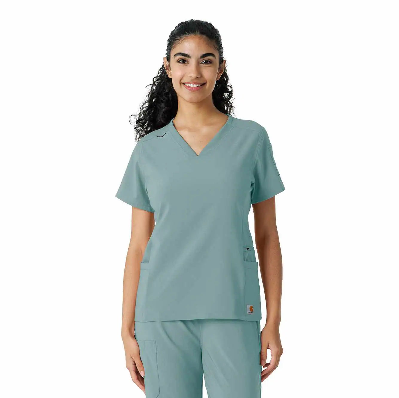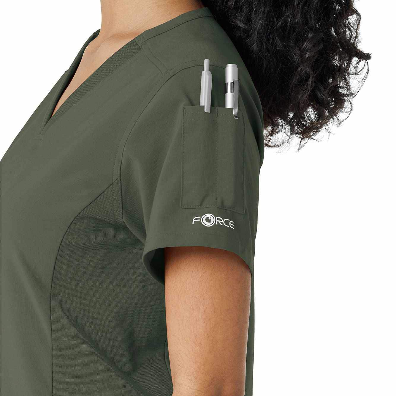 Meet your new favorite scrub top for intense shifts! The Carhartt Force Cross-Flex Women's Knit Panel Scrub Top is designed to move with you, thanks to soft, stretchy fabric that feels more like athletic gear but with a polished, professional vibe. The rib-knit inserts on the sides provide added flexibility, so you stay comfortable no matter the task. With a handy shoulder badge loop and secure zip pocket on the left hip, plus top-loading pockets for essentials, it’s as functional as it is flattering.
