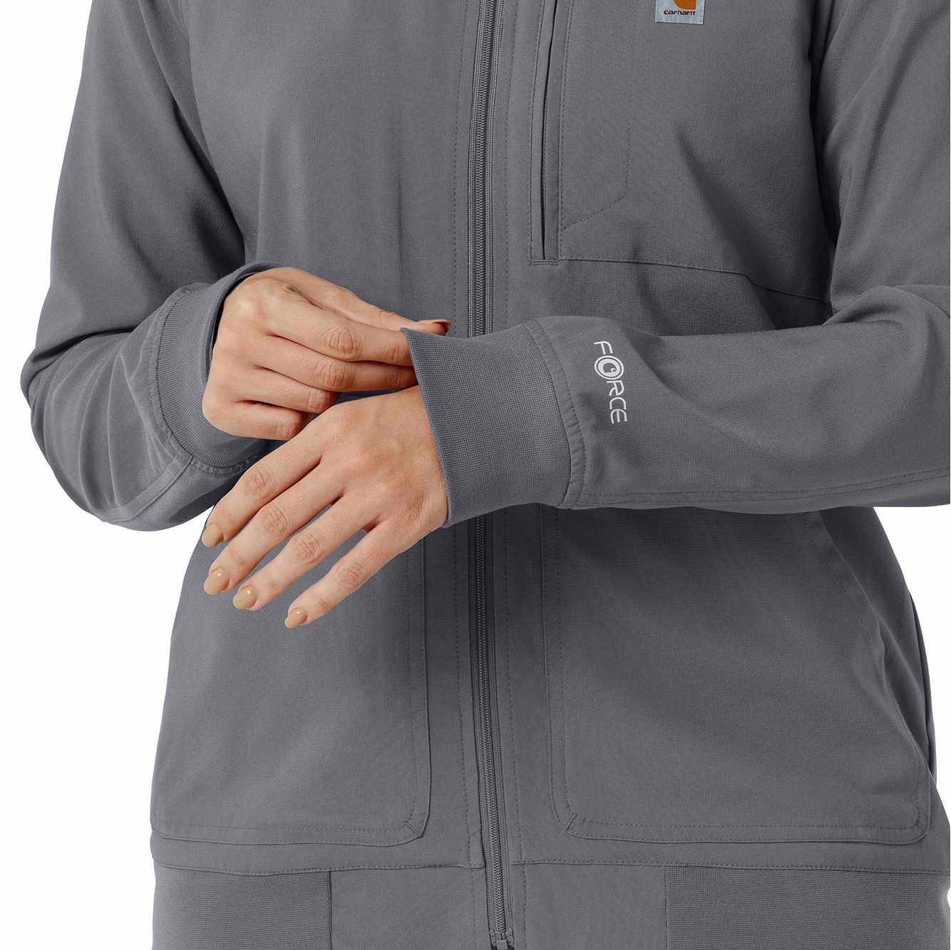 - Carhartt logo zipper pull at front