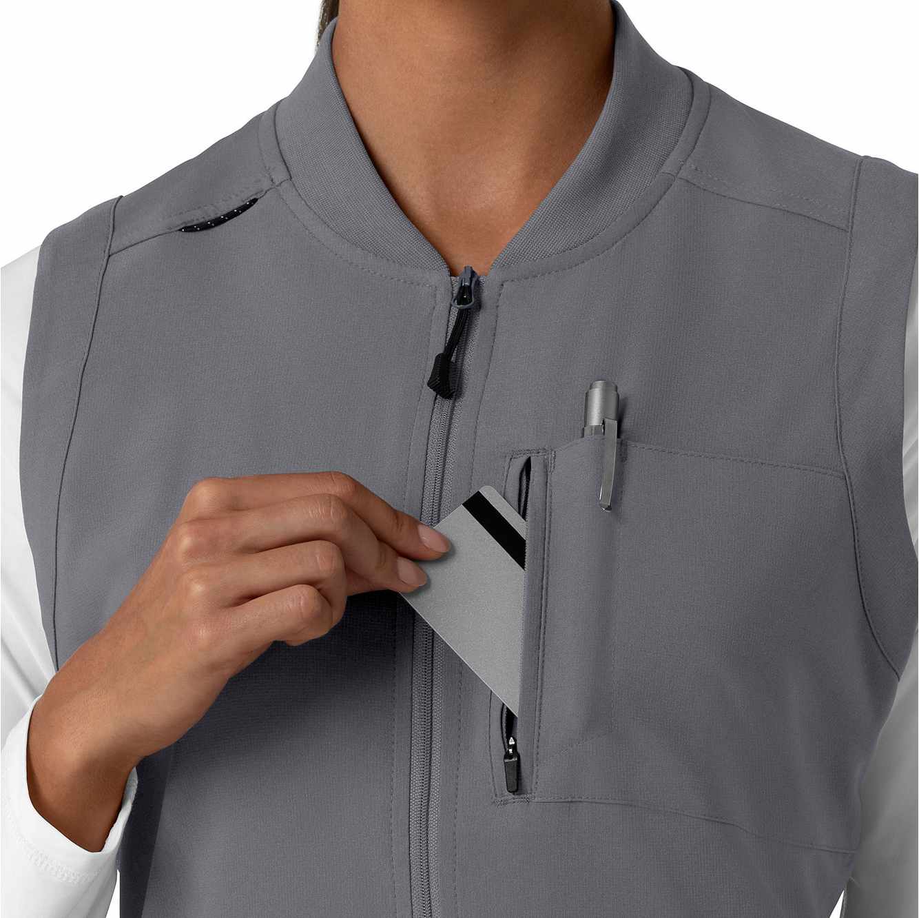- One secure zip pocket, one top loading chest pocket with pen slot, two hand pockets with one pen slot, one internal stethoscope pocket