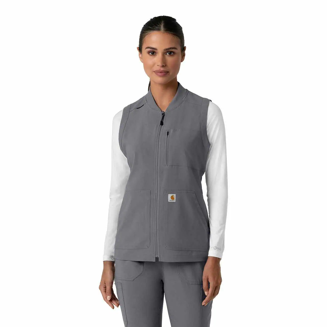 This women's Carhartt scrub vest is designed for the active healthcare professional who values practicality and performance. Built to handle the demands of a busy workday, this vest prioritizes utility and functionality. Utilizing Rugged Flex™ stretch technology, it provides exceptional flexibility, allowing for unrestricted movement during demanding tasks. A key feature is the mesh-lined back vent, which promotes airflow and helps regulate body temperature, keeping you cool and comfortable throughout your shift. The vest is equipped with ample pockets, strategically placed to safeguard all your essential notes, supplies, and personal items. Notably, a dedicated space is provided for your stethoscope, ensuring this crucial tool is always readily accessible. This scrub vest is more than just an outer layer; it's a functional tool designed to enhance your efficiency and comfort. The durable construction and thoughtful design details make it a reliable choice for professionals who need a vest that can keep up with their demanding schedules. It's an ideal addition to any healthcare professional's wardrobe, providing both practicality and comfort.