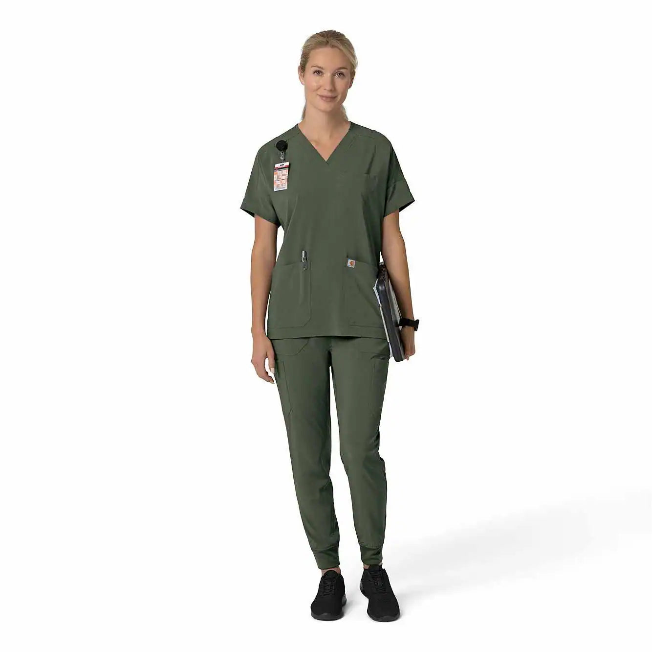 Step into your workday with confidence in the Carhartt Women's Oversized V-Neck Scrub Top. Engineered for healthcare professionals, this scrub top combines style and functionality. The curved V-neck with slim binding and a shoulder badge loop adds a touch of sophistication, while the vented yoke ensures breathability during long shifts. Practicality meets convenience with features like a welt chest pocket, two front top load pockets, a mesh cellphone pocket, and a pen slot. The racerback detail and box pleat at the back provide ease of movement, ensuring you're ready for any task. The straight hem at the front and slightly curved back, along with side vents, create a flattering silhouette. Crafted from a durable and comfortable polyester-spandex blend, this scrub top is not only reliable but also equipped with FastDry® technology to keep you dry under pressure. Elevate your professional look and excel on every shift with Carhartt's Force Cross-Flex collection.