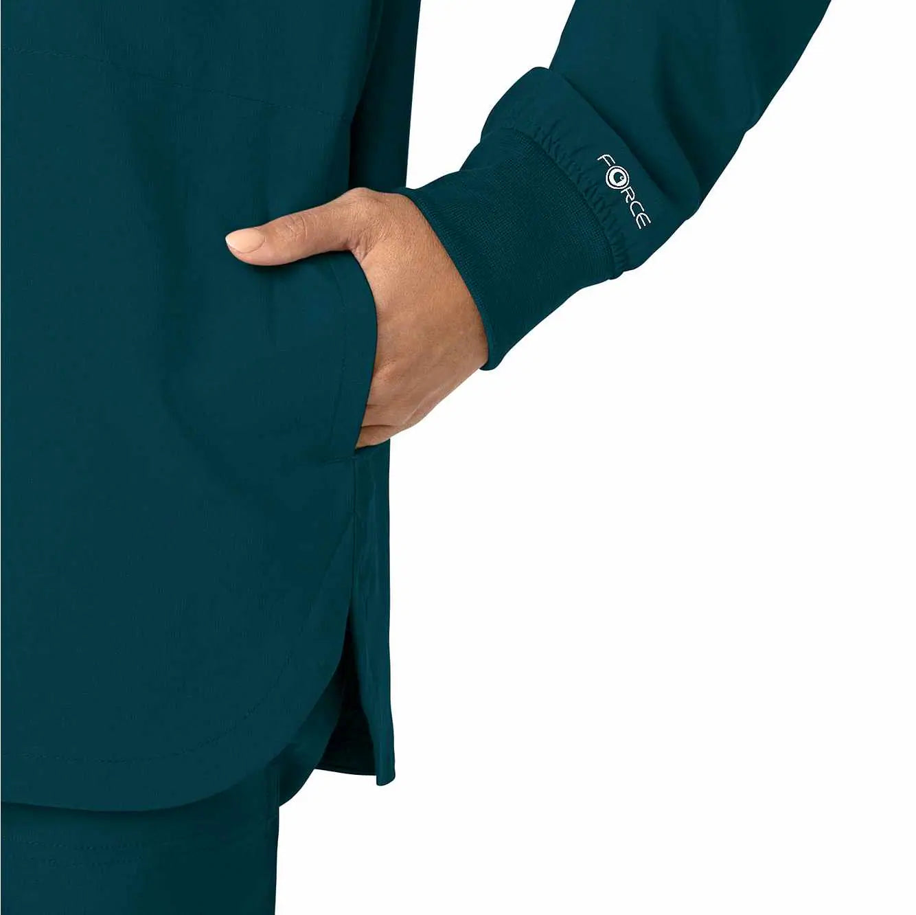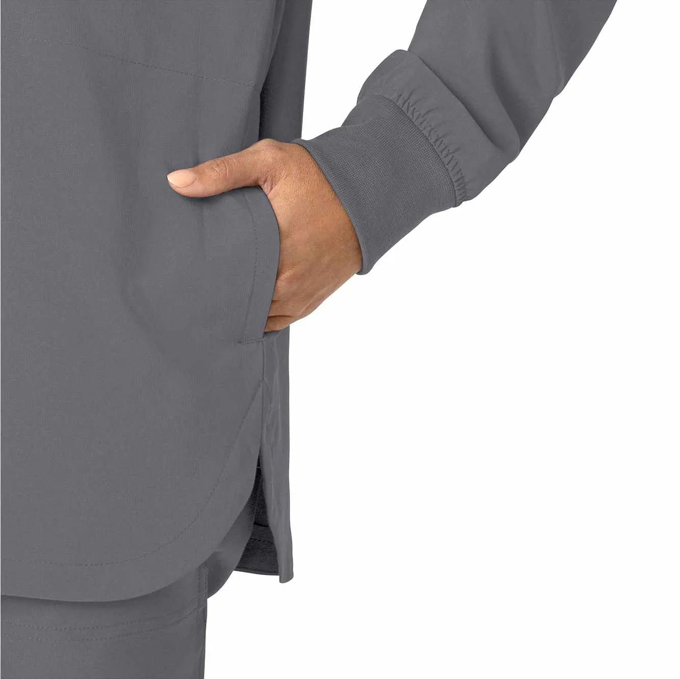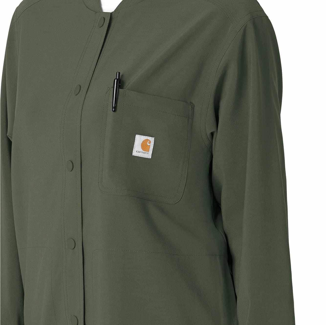 Versatility is the name of your game. You're always ready to switch gears, whether it's completing your own tasks or helping your fellow nurses with theirs. This women's shirt jacket does the same, blending the polished style of a shirt with the coverage of a jacket. It's the perfect layer for days when temperatures fluctuate or the air conditioning varies from room to room. Built for durability, it's made with a stretchy, comfortable fabric that includes micro ripstop to handle the rigors of your daily life at work. A knit collar and snap-button front accent the design for a cozy touch that adds just the right amount of tailoring. Keep everything where you need it with a chest pocket built with a pen slot plus internal loops for your badge or glasses. The lower front pockets are oversized, and there's even a pocket just for your phone for fumble-free access. This shirt jacket is part of our Force Cross-Flex collection, designed to help you excel on every shift. It wicks sweat and dries fast, and it's built to move with Rugged Flex™ stretch technology.