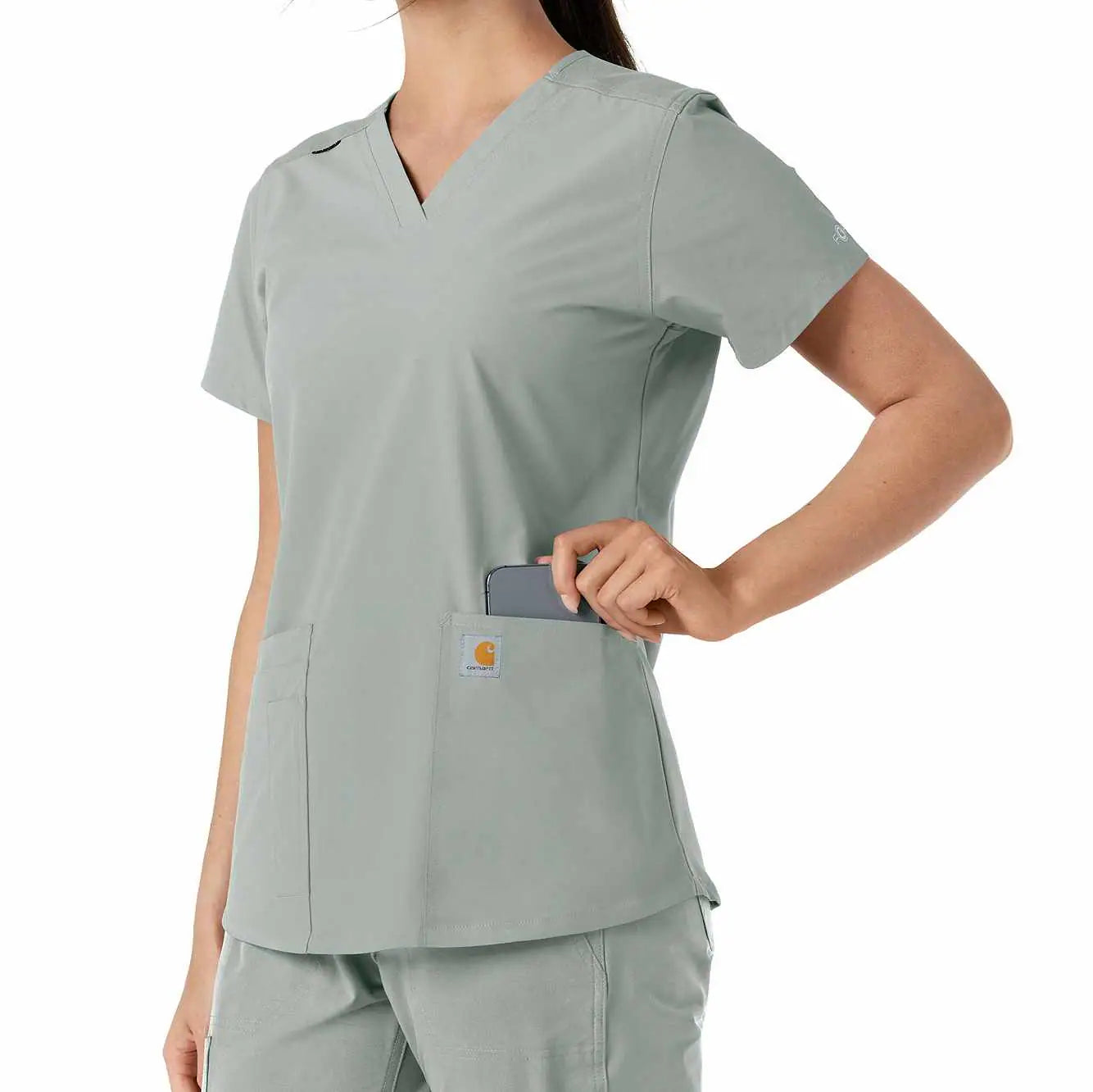 Stay comfortable and move freely with the Carhartt Force Essentials Women's V-neck Scrub Top. Featuring a back yoke knit panel, this top offers flexibility and a tailored fit with a 3/4" V-neckline and curved hem. FastDry® tech wicks away sweat, and Stain Breaker® makes stain removal easy. With two roomy front pockets, an ID badge loop, and dedicated cell phone and scissor pockets, it's built for utility and comfort.
