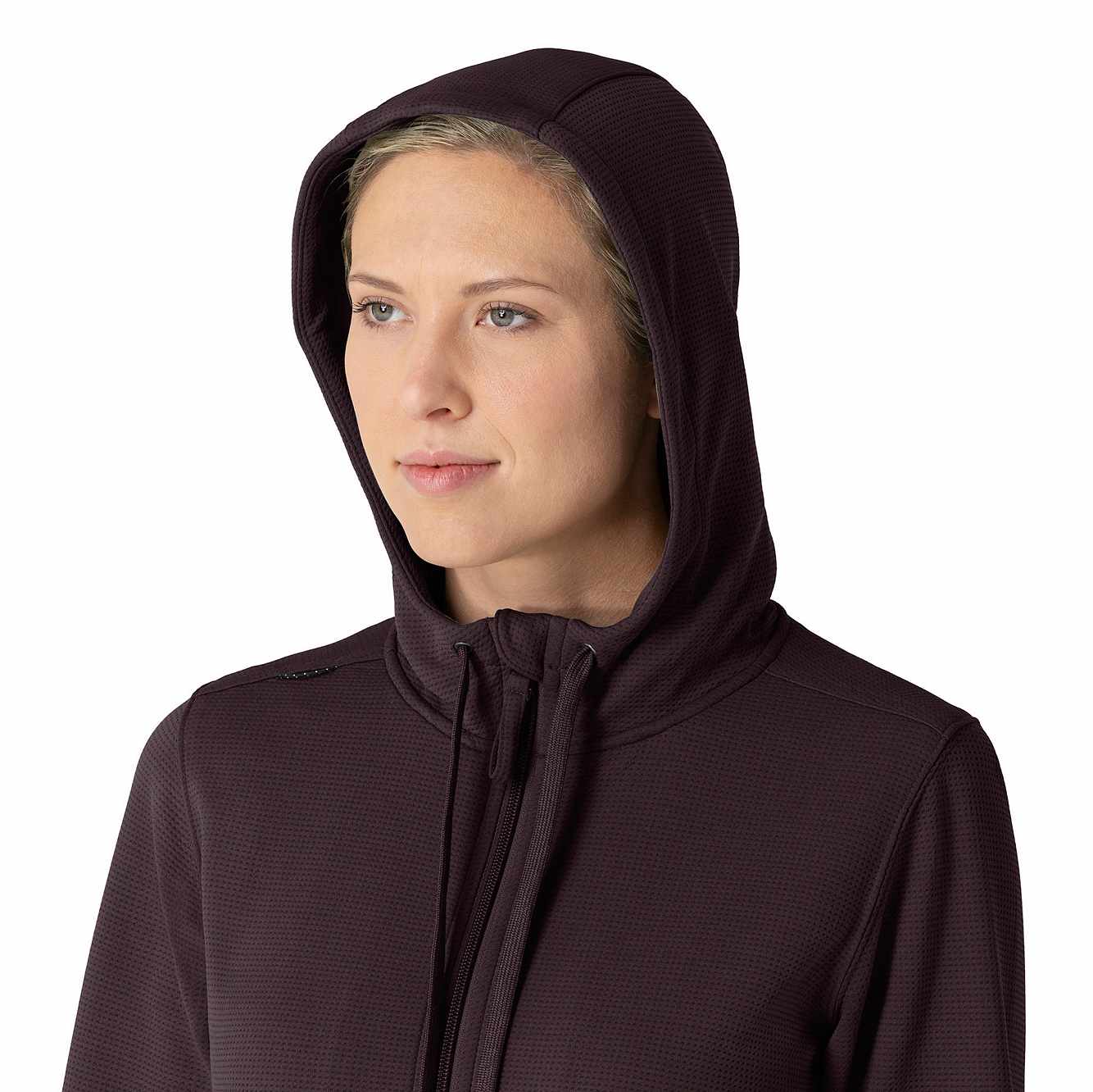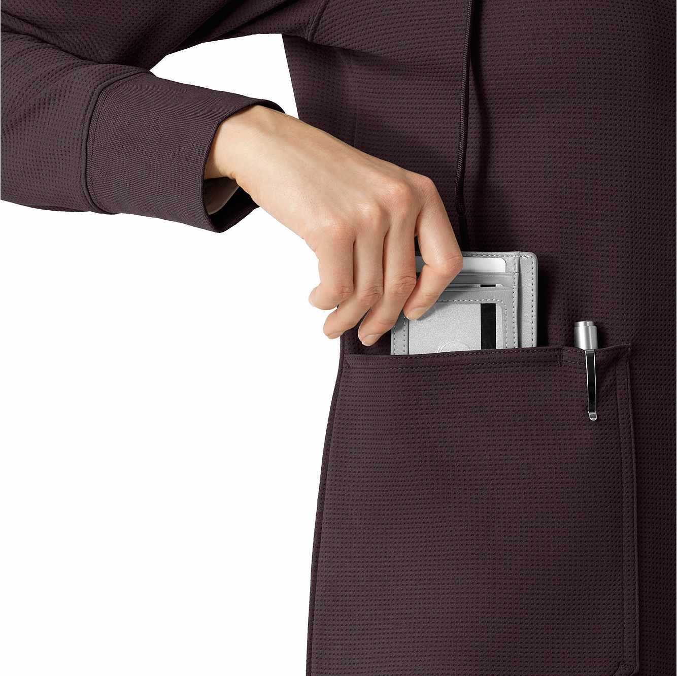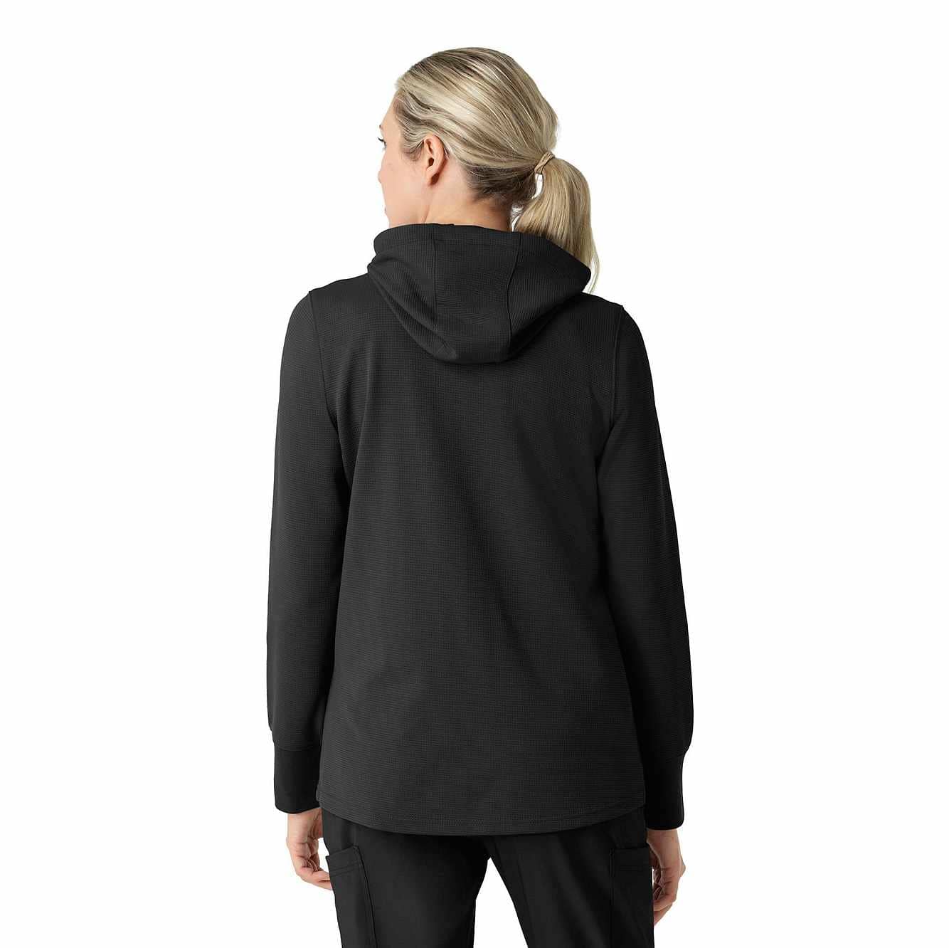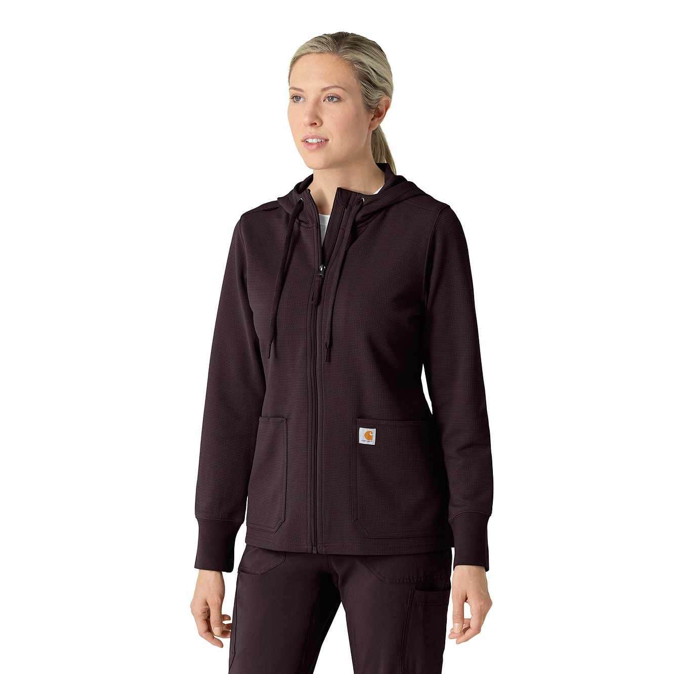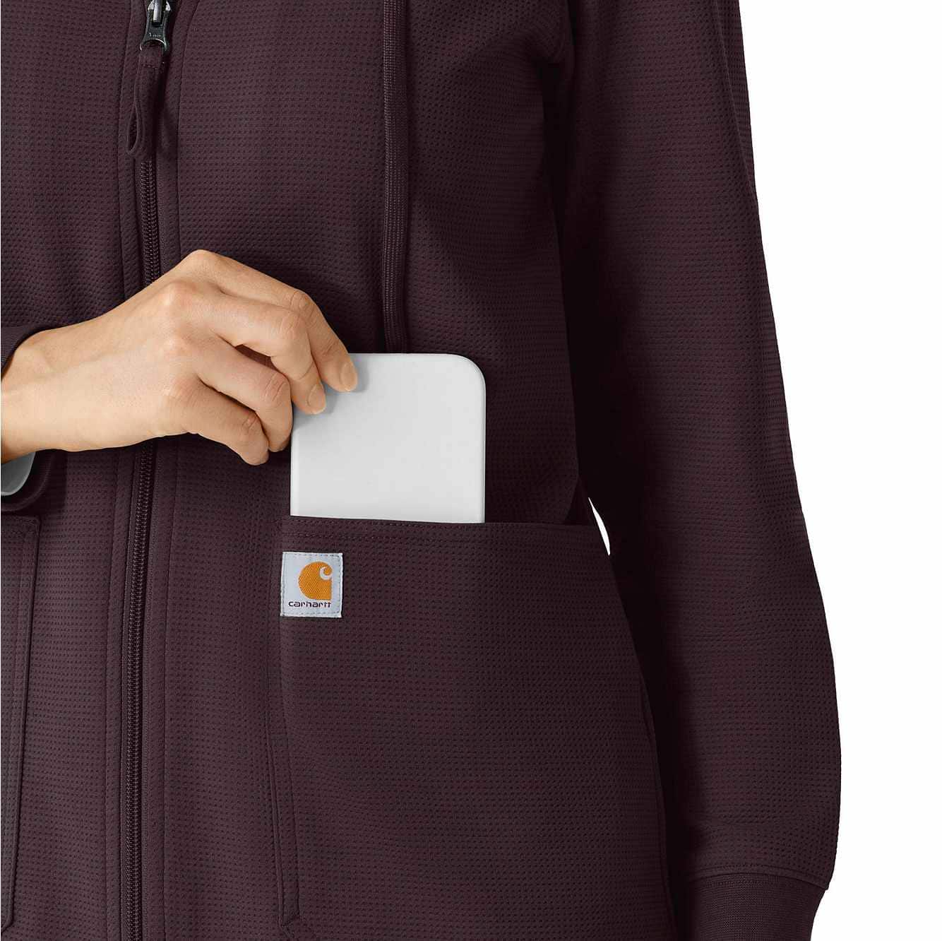 This women's Carhartt hoodie seamlessly blends the brand's signature casual style with the practical performance features essential for busy professionals. Crafted from a comfortable waffle-knit polyester fabric, it offers a soft yet durable layer for everyday wear. The full-zip design allows for easy on and off, providing versatile temperature control. Functionality is prioritized with an abundance of pockets, ensuring you have ample space for all your necessities. Notably, an internal stethoscope pocket keeps this crucial tool secure and readily accessible. The extra-long knit cuffs are designed to be compatible with gloves, providing a seamless and comfortable fit that eliminates gaps and enhances protection. A badge loop at the shoulder ensures your ID is clearly displayed, streamlining identification processes and enhancing workplace efficiency. This hoodie is more than just a casual garment; it's a carefully designed piece of performance wear built to meet the demands of your busy schedule while maintaining a comfortable and stylish appearance. It's the perfect combination of Carhartt's rugged durability and thoughtful design, making it an ideal choice for any healthcare professional seeking a reliable and functional hoodie.