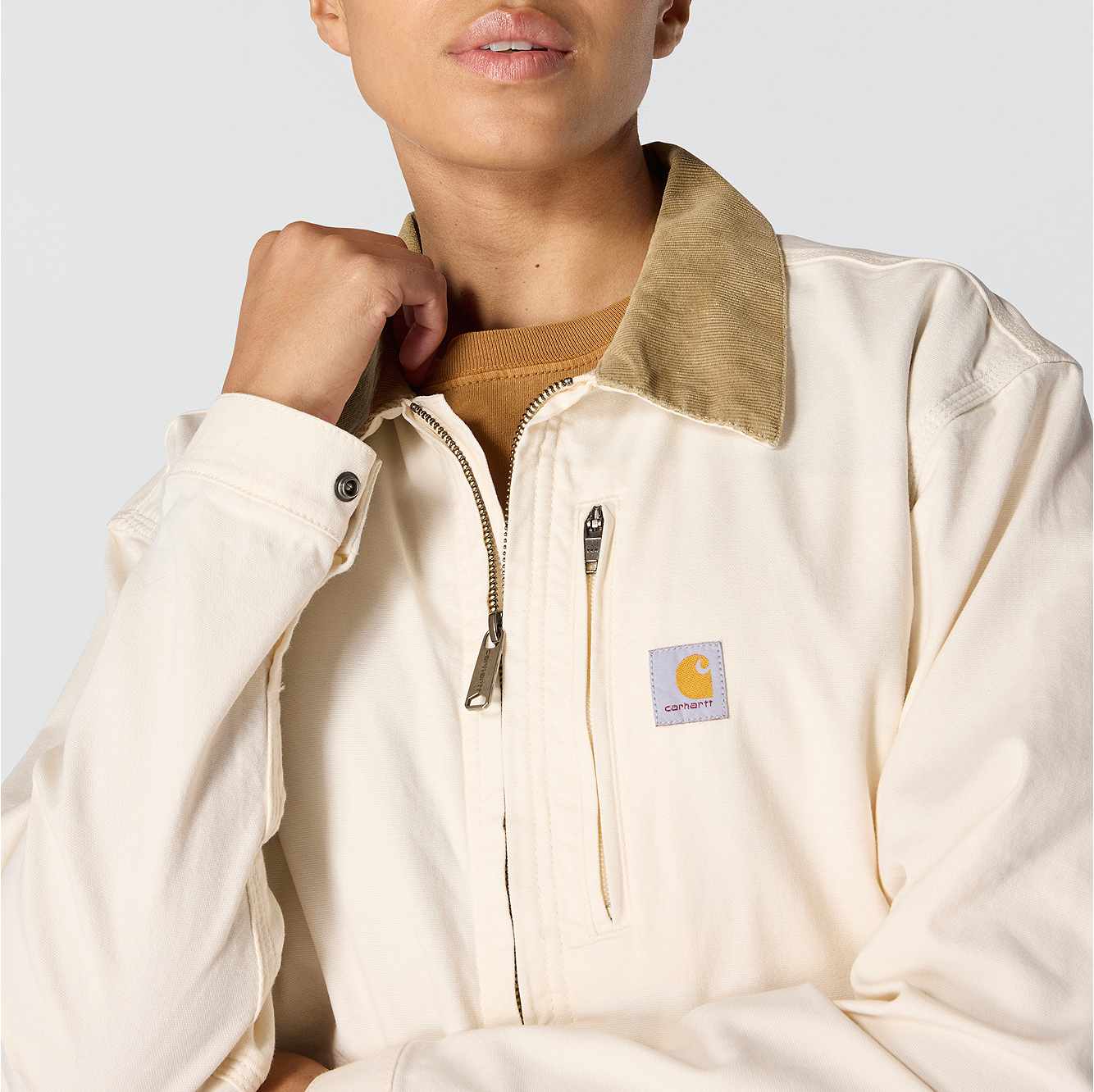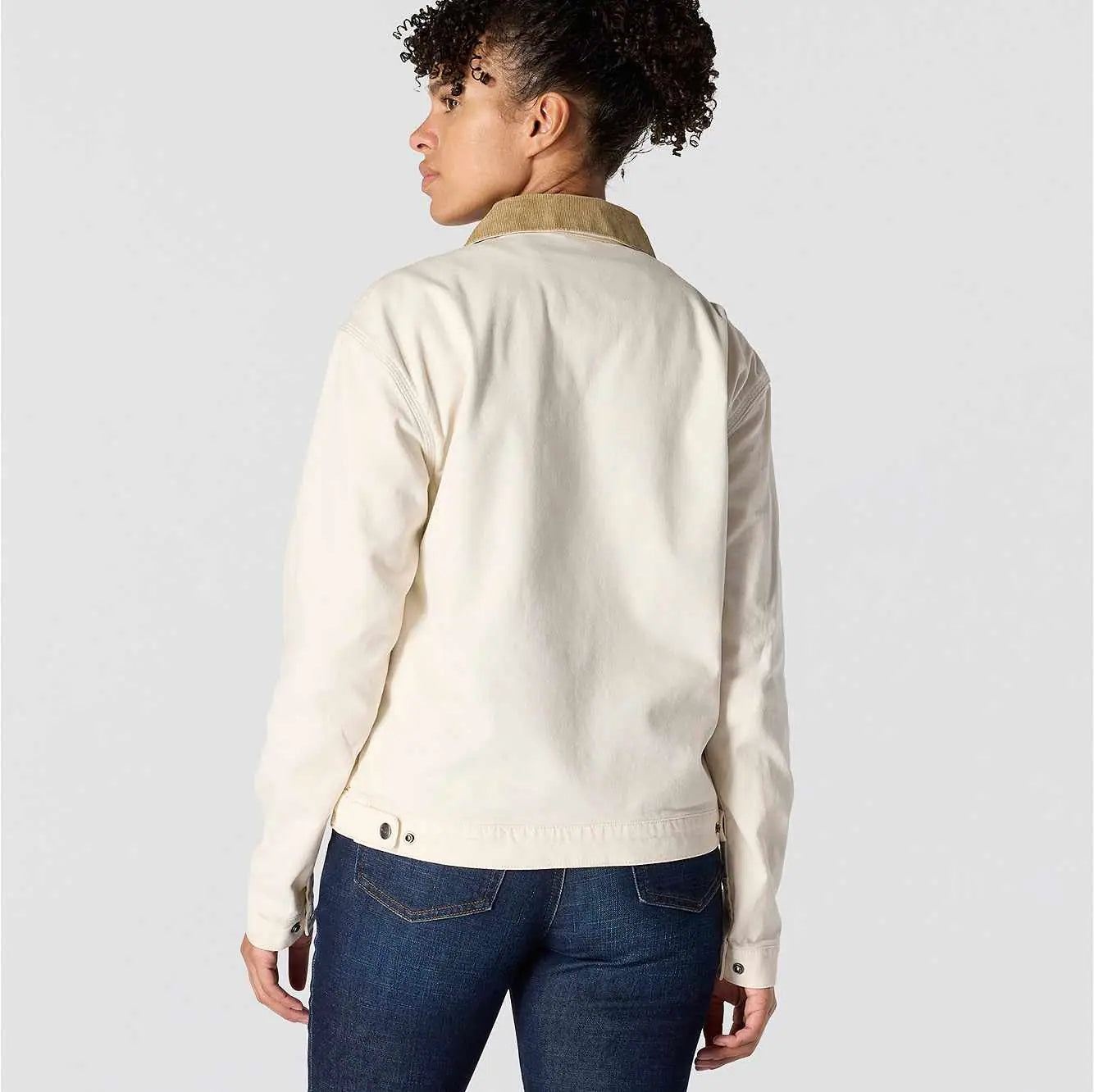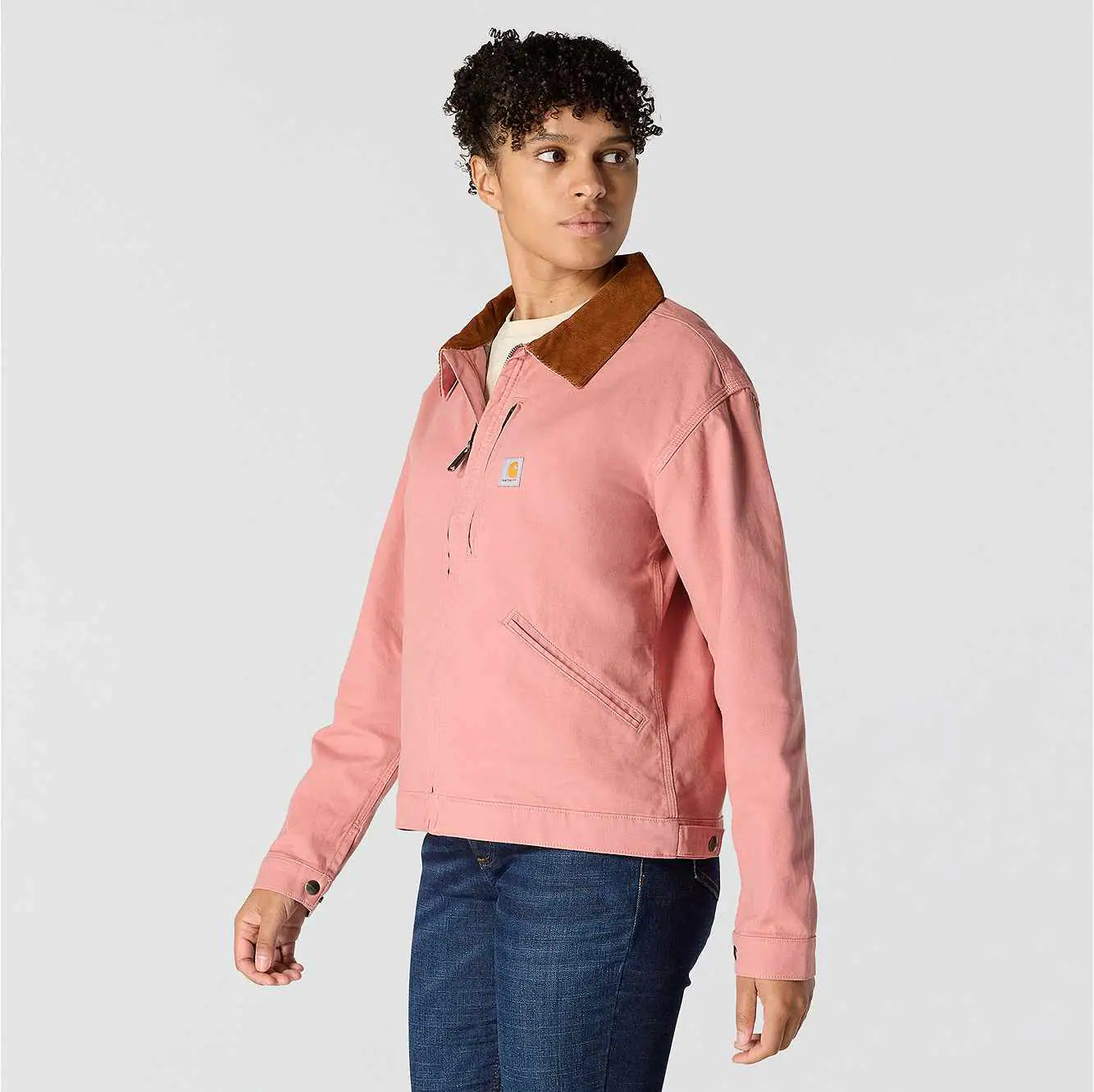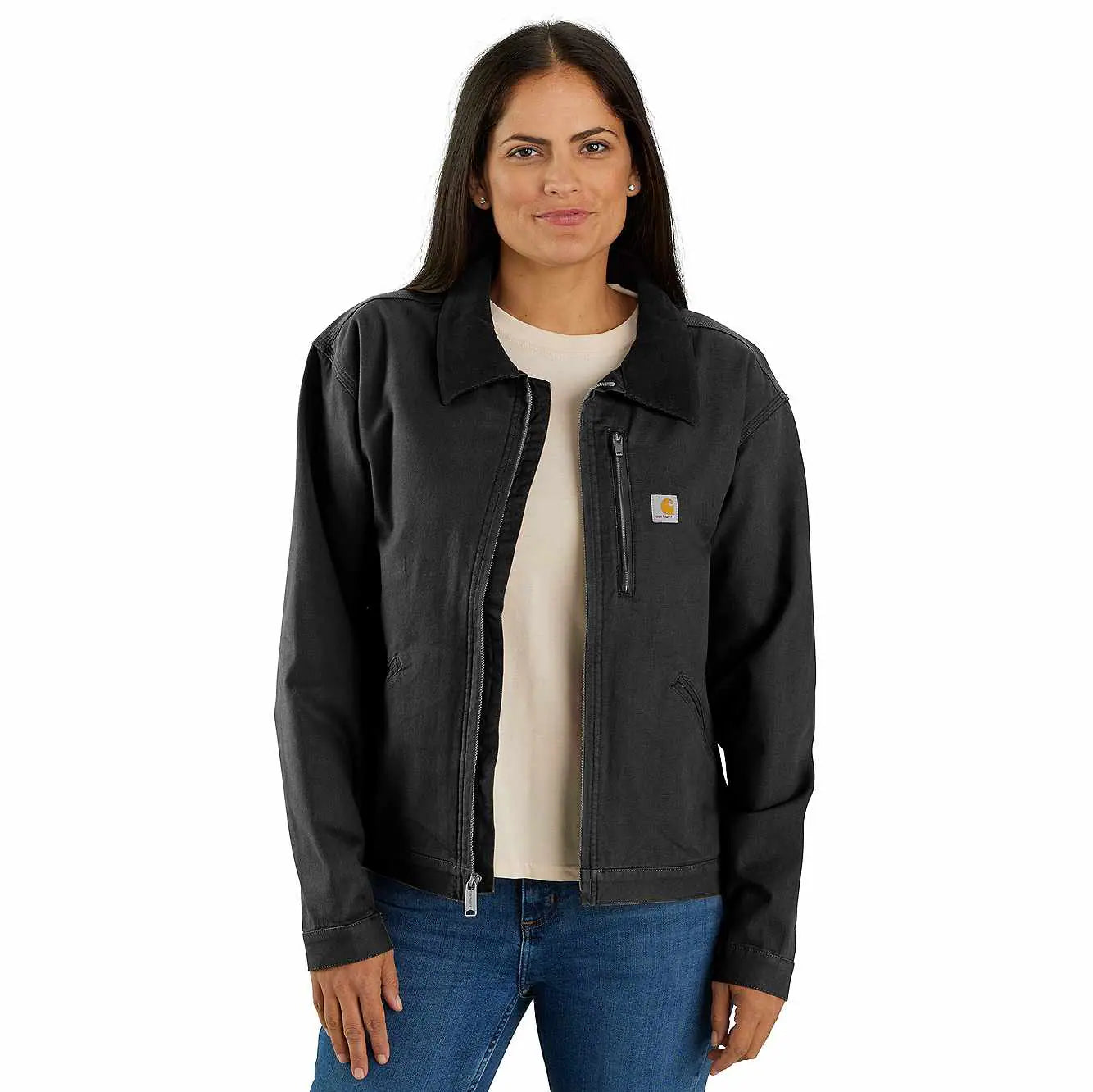 A hardworking staple for over 70 years, the legacy of the Detroit jacket is as long-lasting as its durable duck canvas. This women's Carhartt jacket was inspired by the classic with built-in flex for easy movement. Welt pockets and interior pockets keep the tools of your trade close by, and a snap-adjustable hem lets you customize the fit. A loose fit makes layering easy.