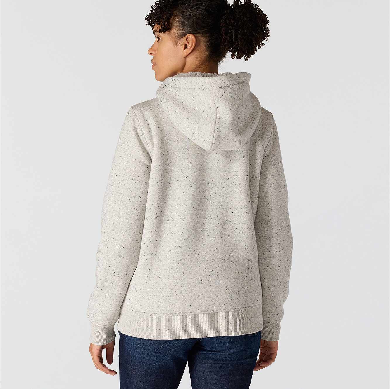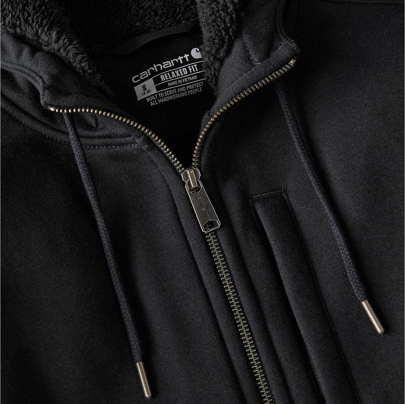 Weekend project or brisk evening around camp, this women's full-zip Carhartt sweatshirt packs the warmth to get you though cool days and nights. It's lined with thick sherpa fleece including the hood for warmth that you can feel as soon as you pull it on. The relaxed fit sits closer to the body than our loose fit but still offers a little extra room to move.