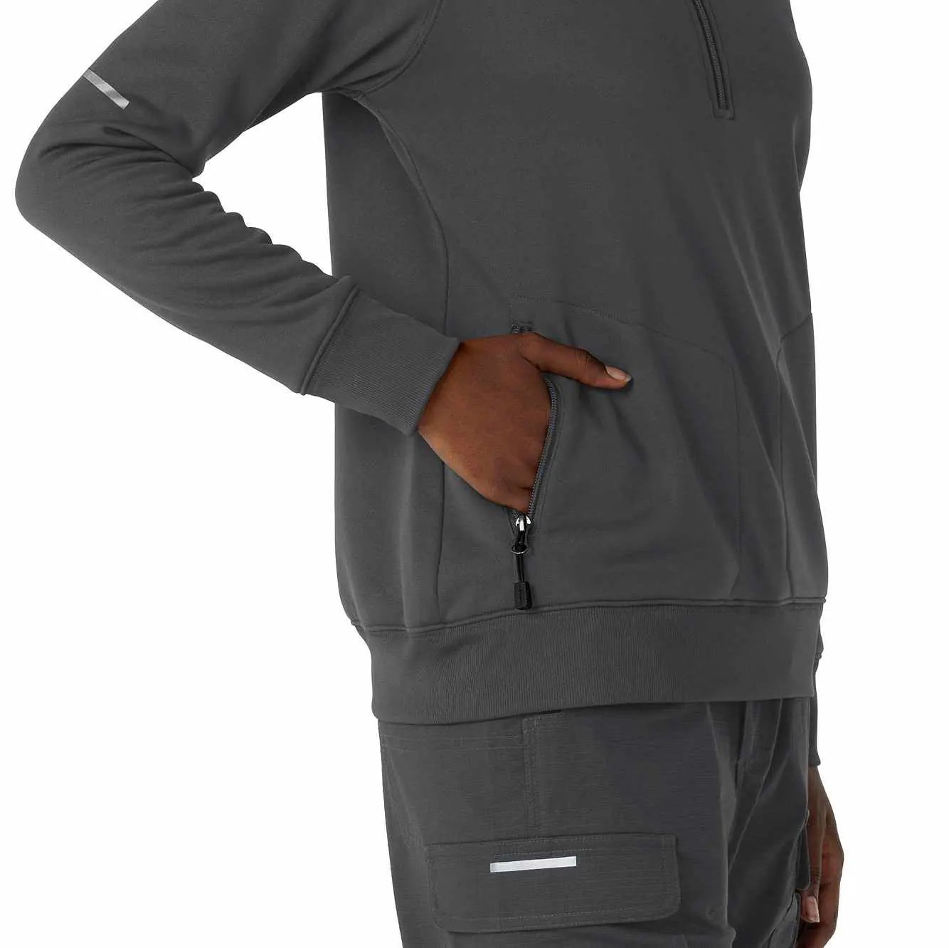 When your work takes you into unpredictable environments and challenging conditions, you need a layer that's ready for anything. This women's half-zip pullover is designed to provide reliable warmth and protection, no matter where your job leads you. Crafted from a cozy polyester fleece with a Durable Water Repellent (DWR) coating on the body, this half zip offers exceptional warmth and protection against light rain and moisture. The half-zip design allows for easy ventilation and temperature regulation, ensuring you stay comfortable in fluctuating conditions. Functionality is key, and this pullover is equipped with four pockets to keep your essentials organized and secure. Two of these pockets feature zippers, providing added security for valuables like your phone or wallet. Whether you're navigating a chilly worksite or braving the elements outdoors, this half zip is a versatile and reliable choice. With its combination of warmth, weather resistance, and practical features, this women's half-zip pullover is a must-have for anyone who demands versatility and performance from their gear. It's a dependable layer that will keep you comfortable and prepared, no matter what challenges come your way.