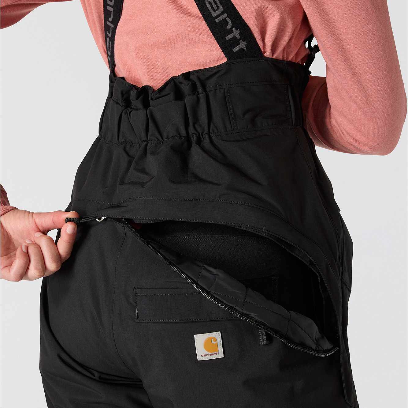 Carhartt durability meets all-weather coverage and insulation in these women's waterproof bibs. A combination of a Storm Defender® waterproof, breathable protection and an insulated, wind-resistant build seals out cold, wet weather. Synthetic insulation in the legs seals in heat without bulk. Ankle-to-knee side zips make for easy on and off over boots, and a drop seat makes for easy breaks. A relaxed fit includes a little extra room in the seat and thighs.