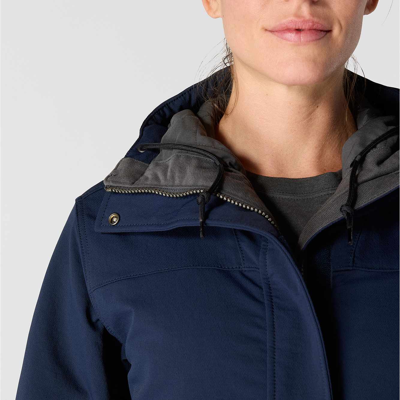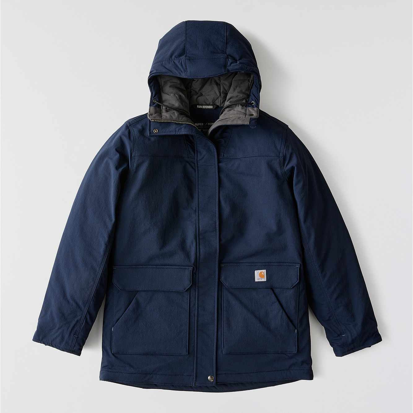 Carhartt has been working hard since 1889 to insure you have the best gear out there to get the job done. This women's jacket is made of durable nylon with built in stretch for easy movement. The water-resistant build protects against light rain and wind, while 100-gram insulation provides warmth without adding bulk.