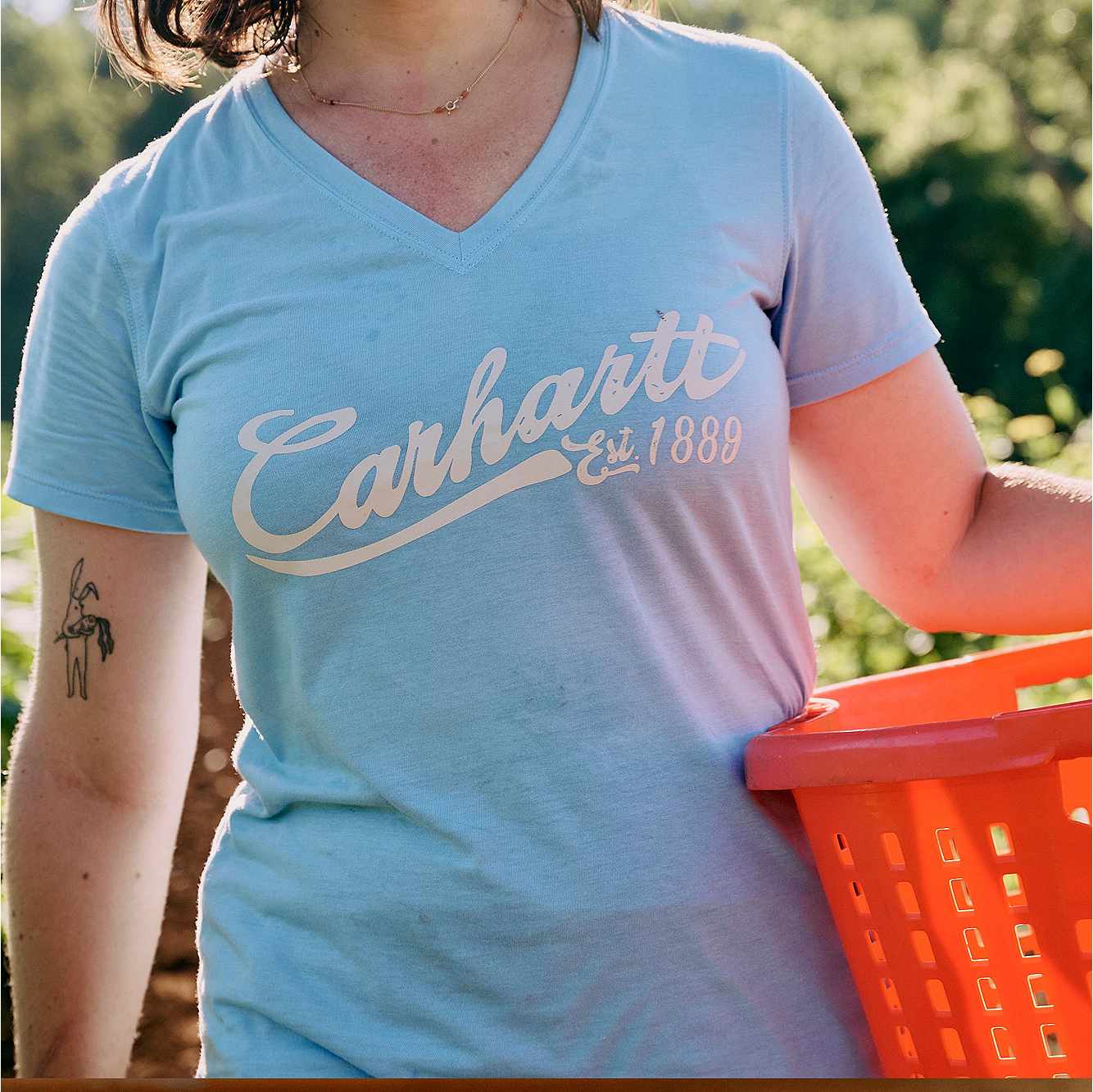 Soft and lightweight, this women's V-neck t-shirt redefines what comfort means in workwear. Made from breathable TENCEL™ fibers that don't sacrifice durability. Built for a relaxed fit, with a Carhartt graphic on the front.